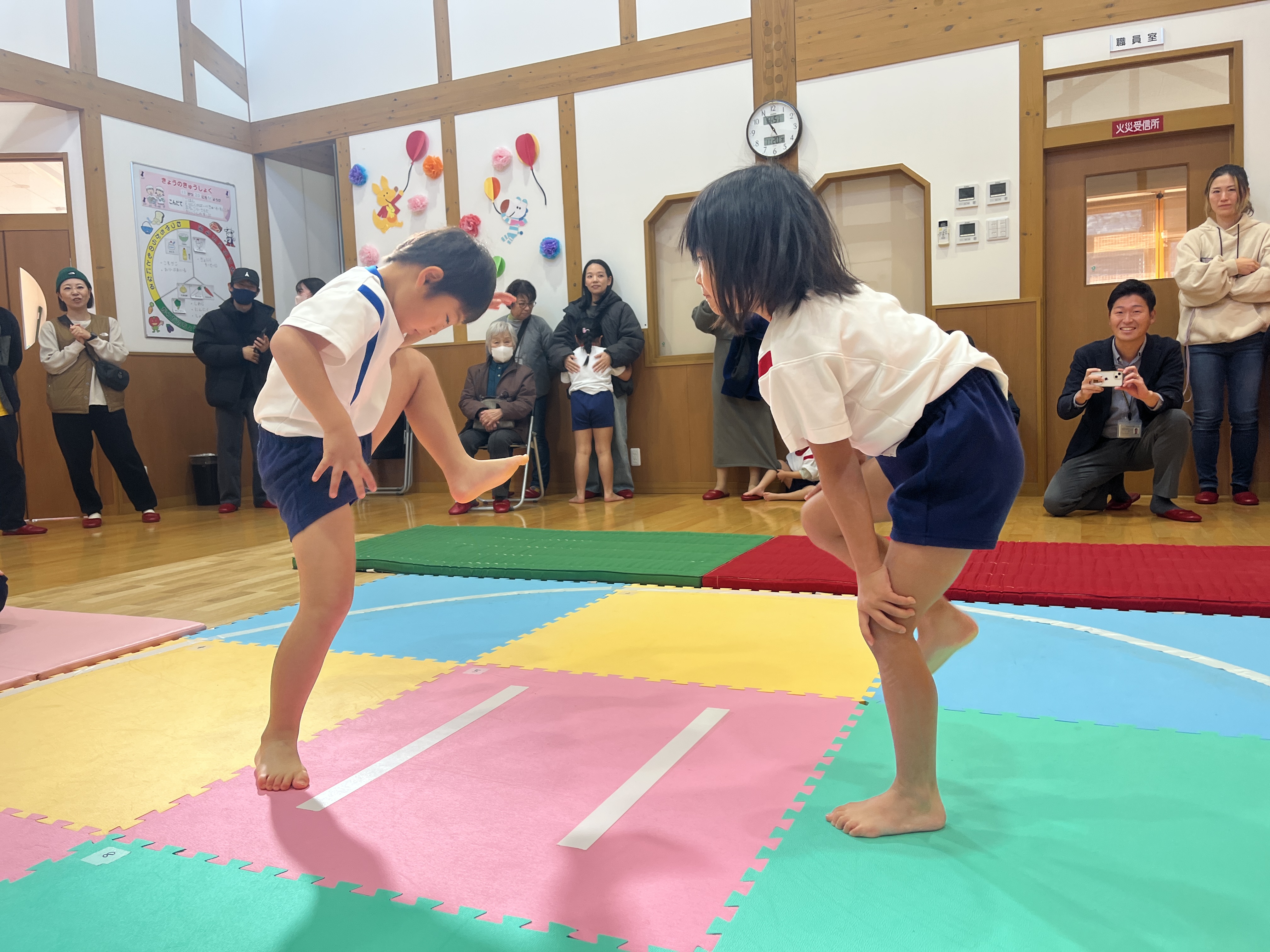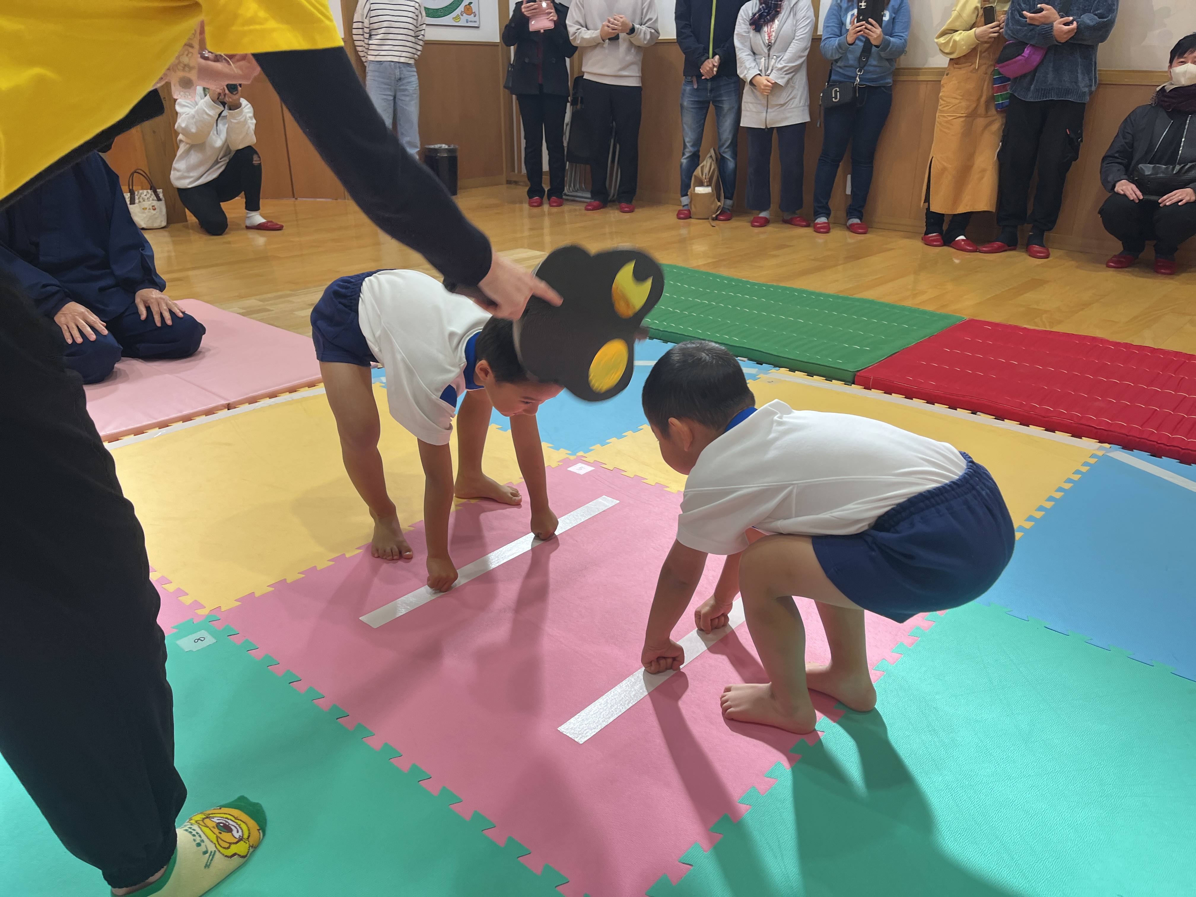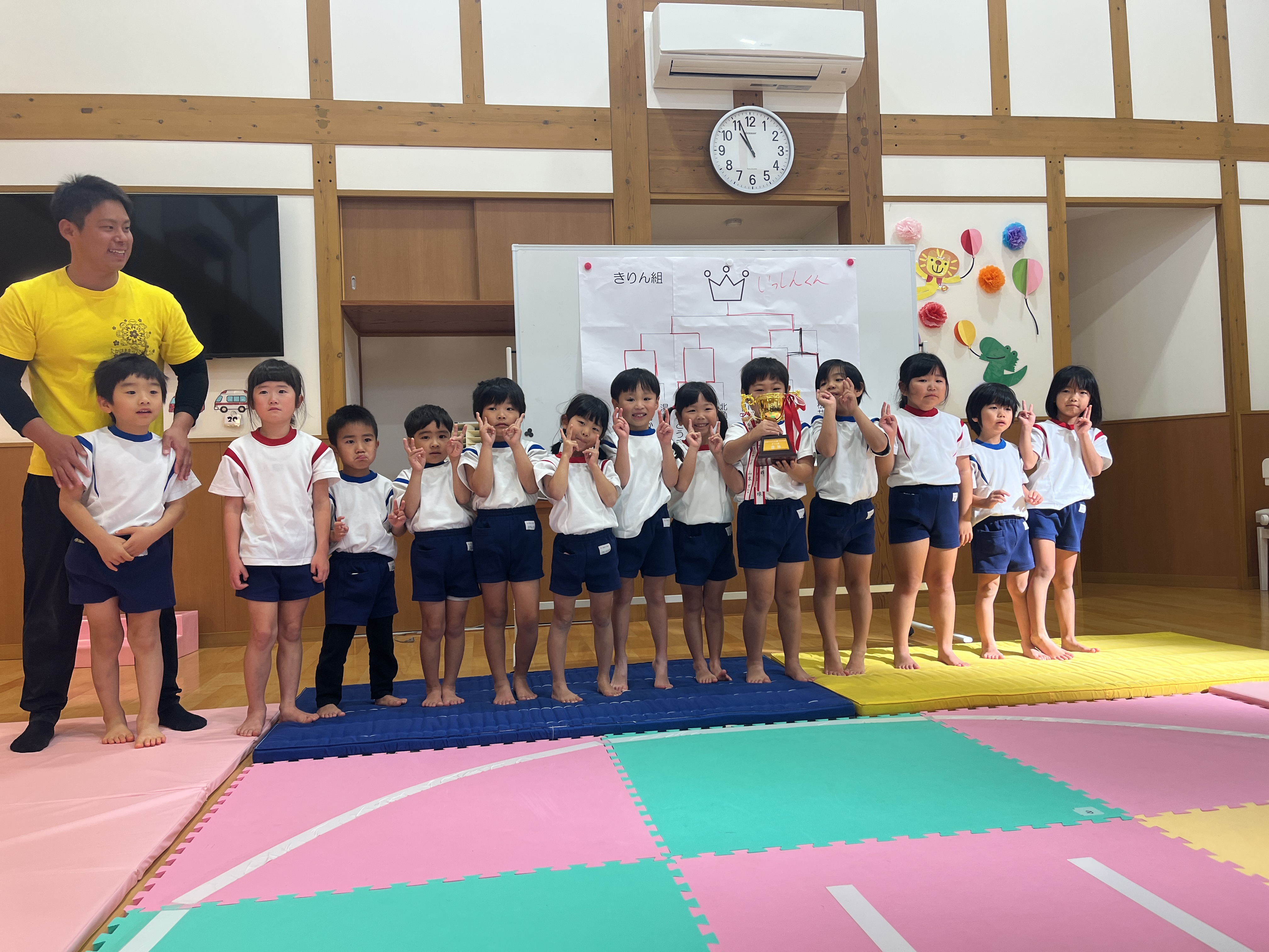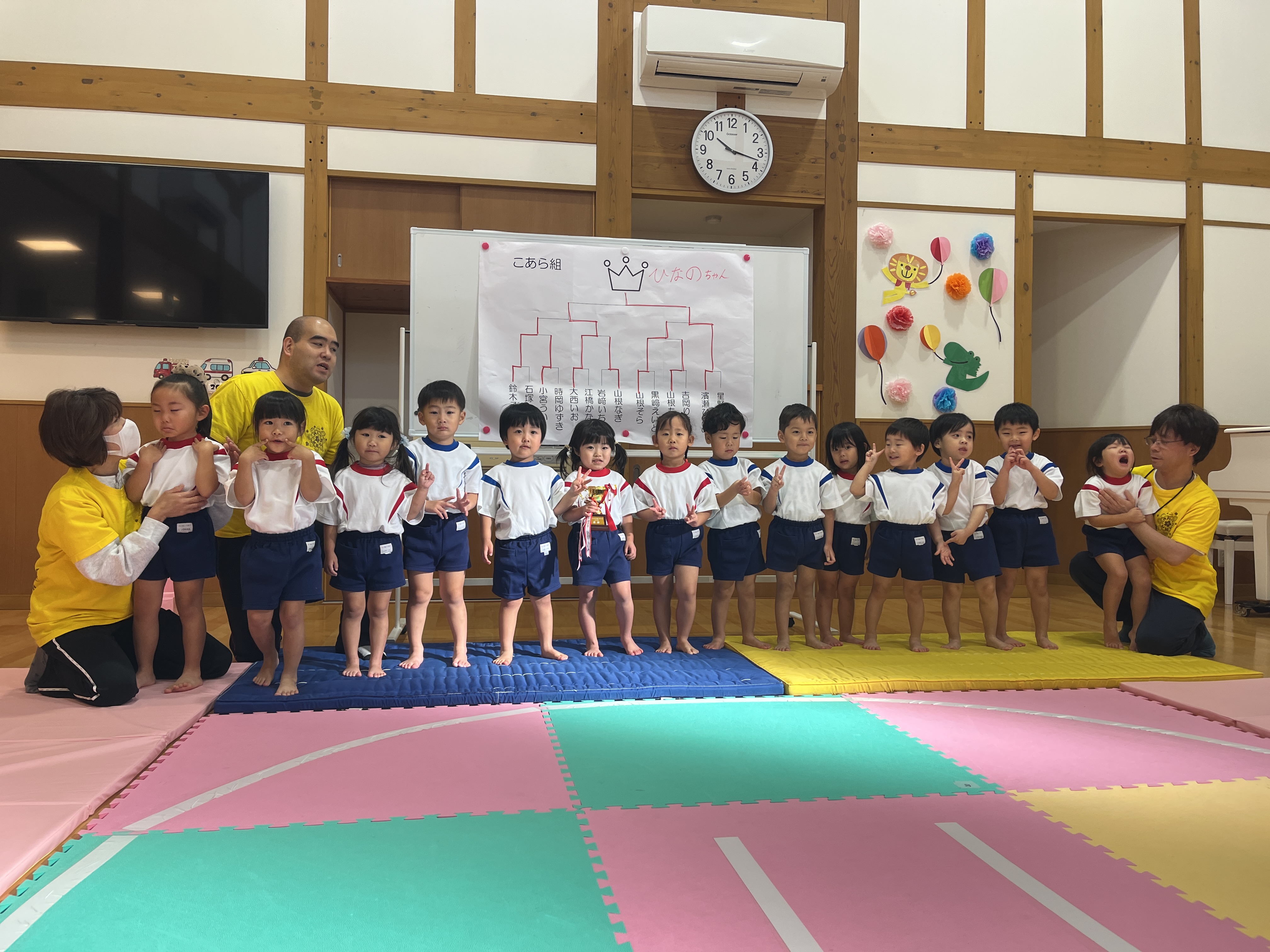 - 土俵際で粘ったり、こけそうになっても踏ん張ったりと、きりん組らしい取り組みがたくさん見られました。