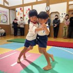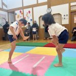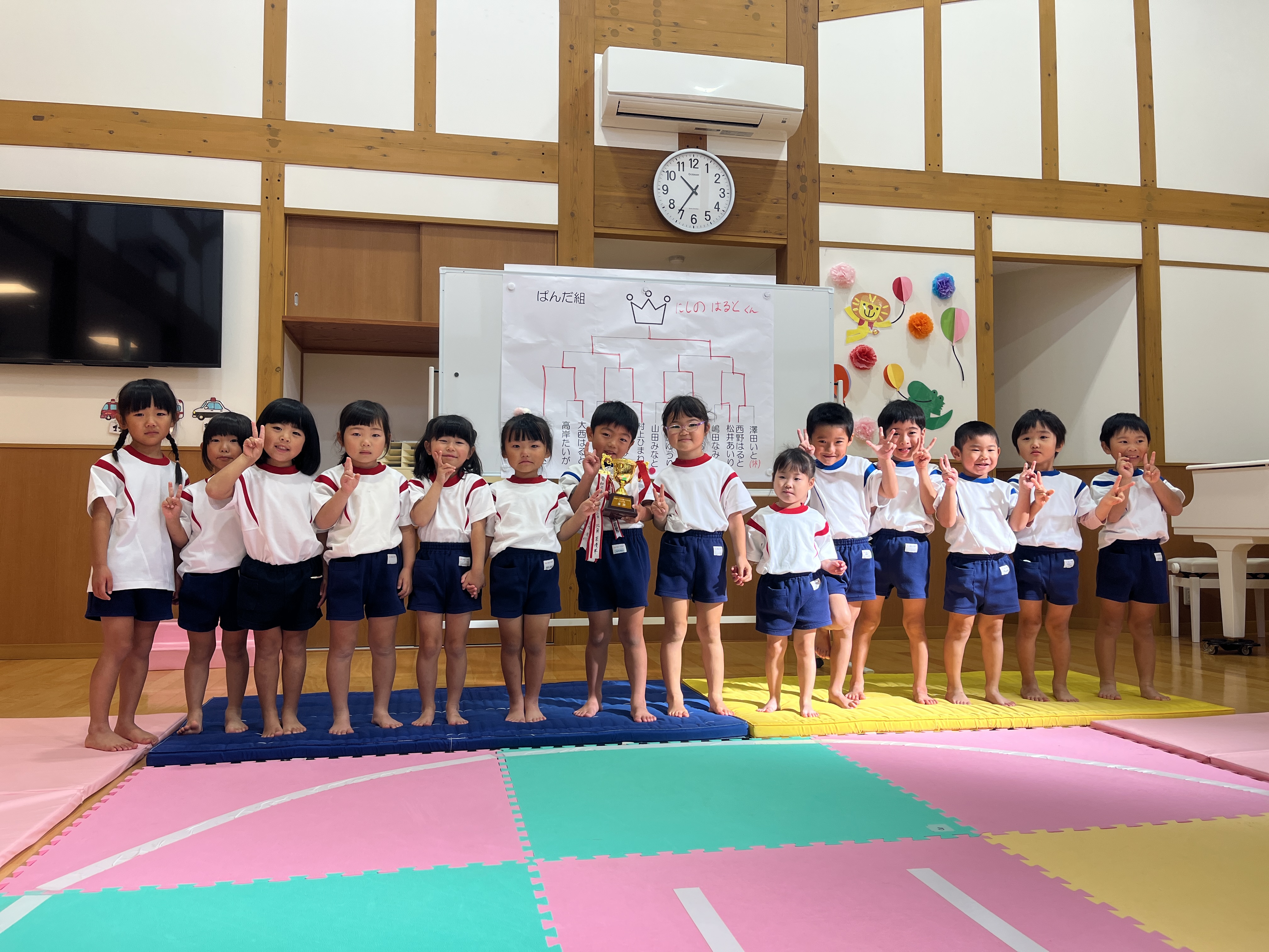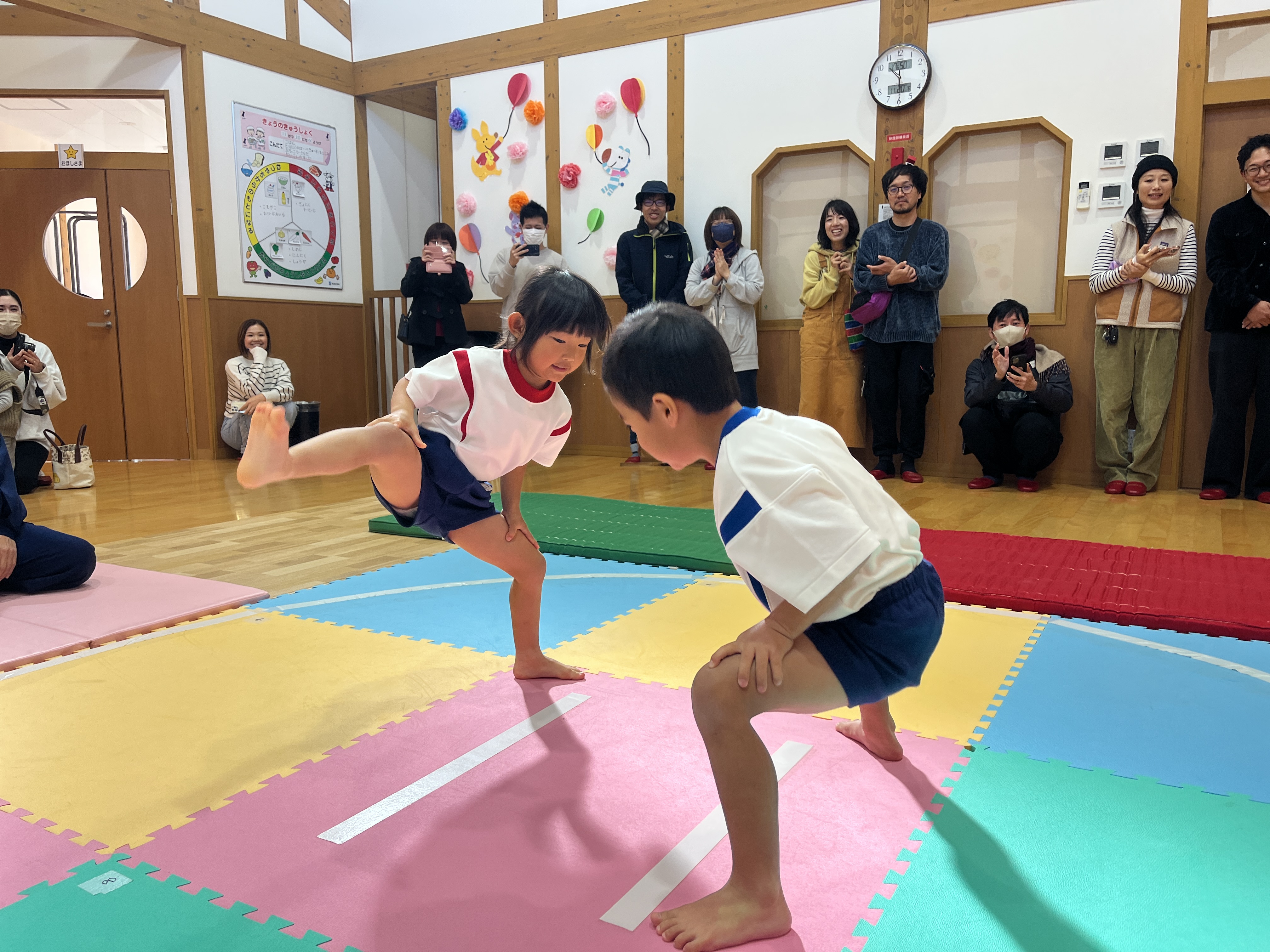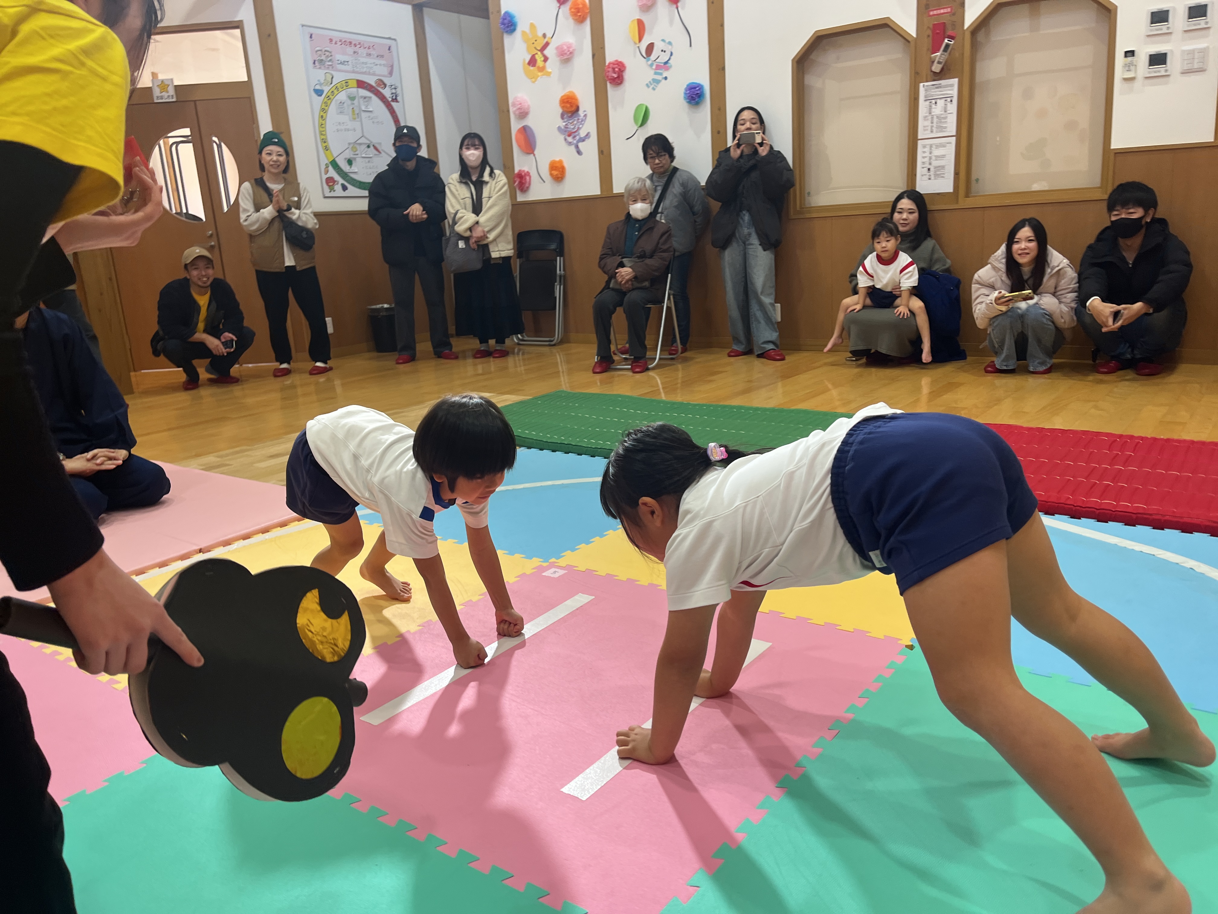 - 土俵際で粘ったり、こけそうになっても踏ん張ったりと、きりん組らしい取り組みがたくさん見られました。