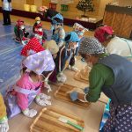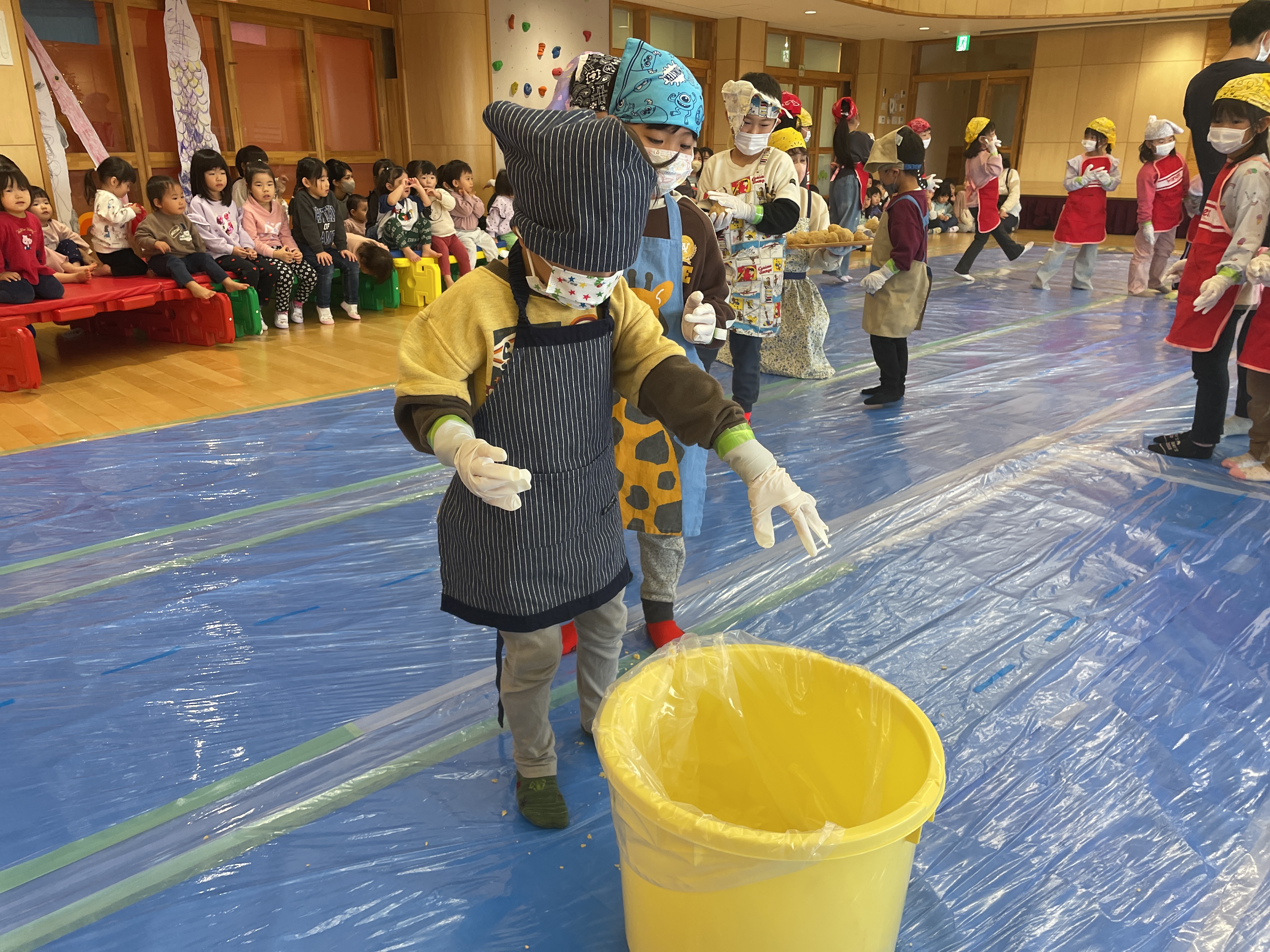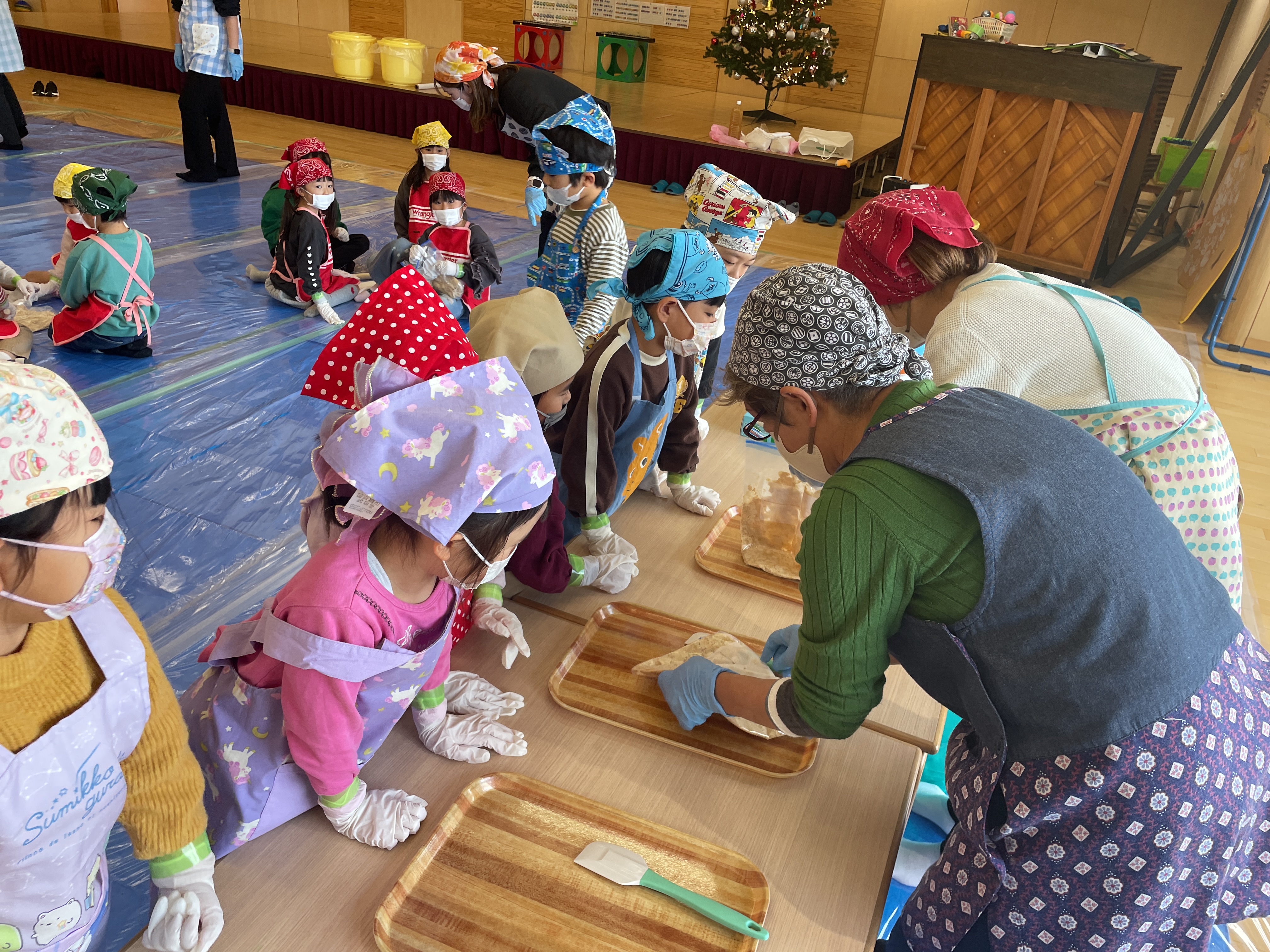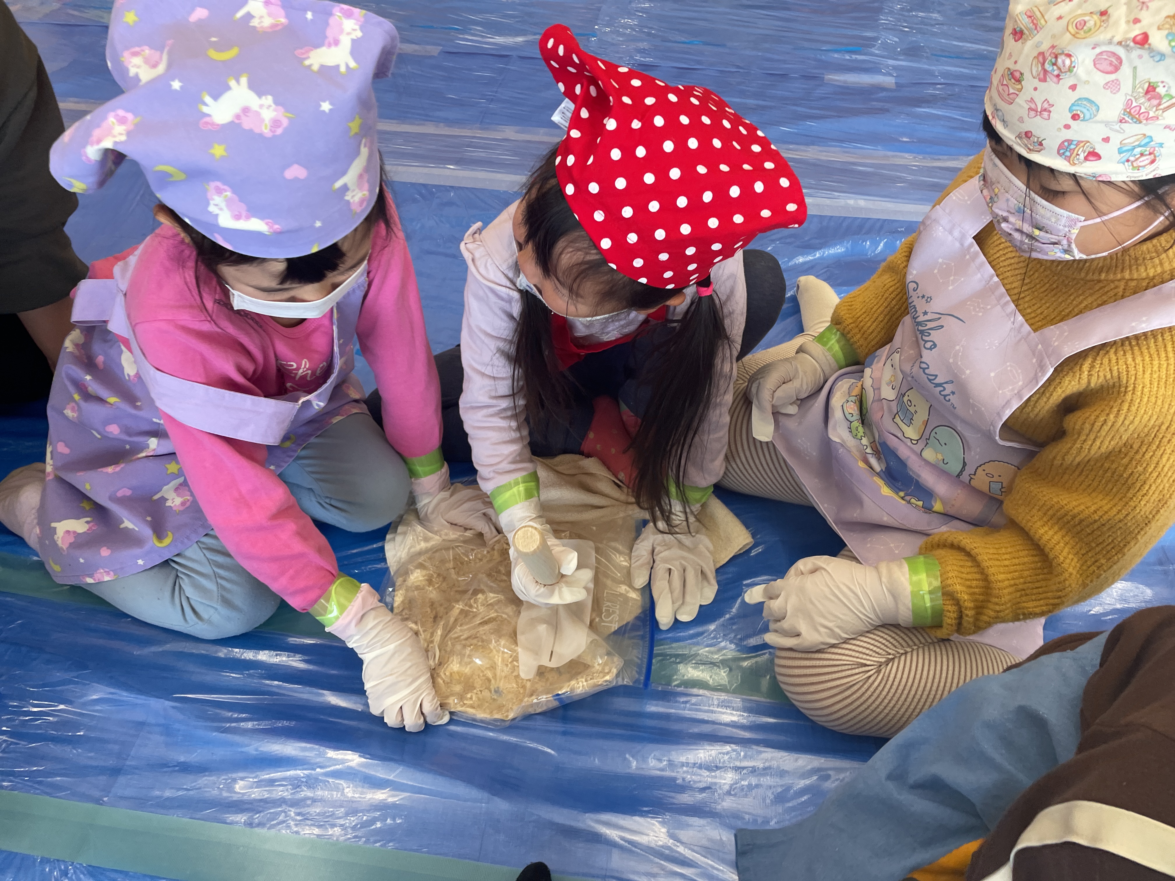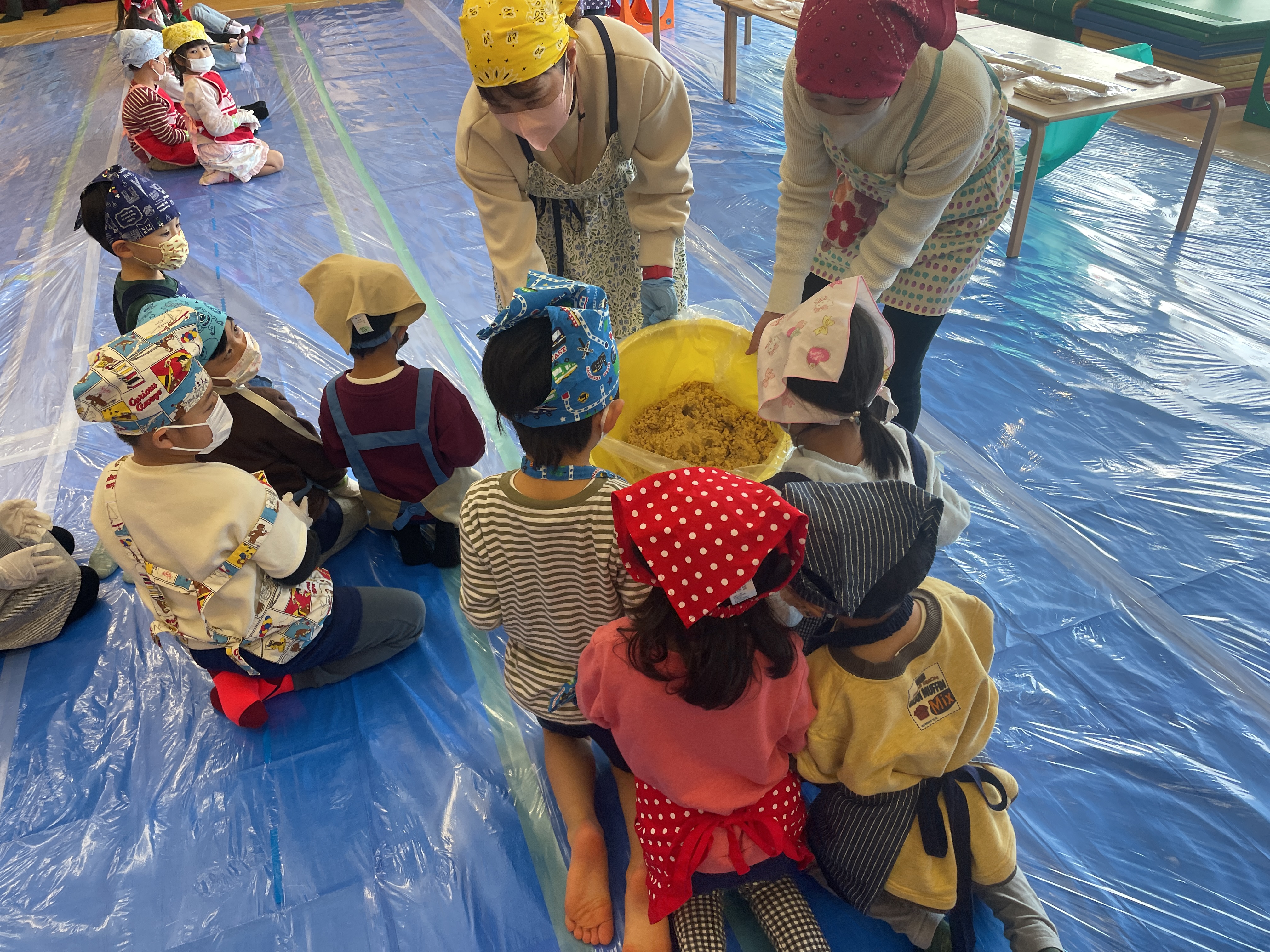 12月22日(月)に、きりん組が、認定こども園cocokaraの年長児と一緒にみそ作り体験を行いました。