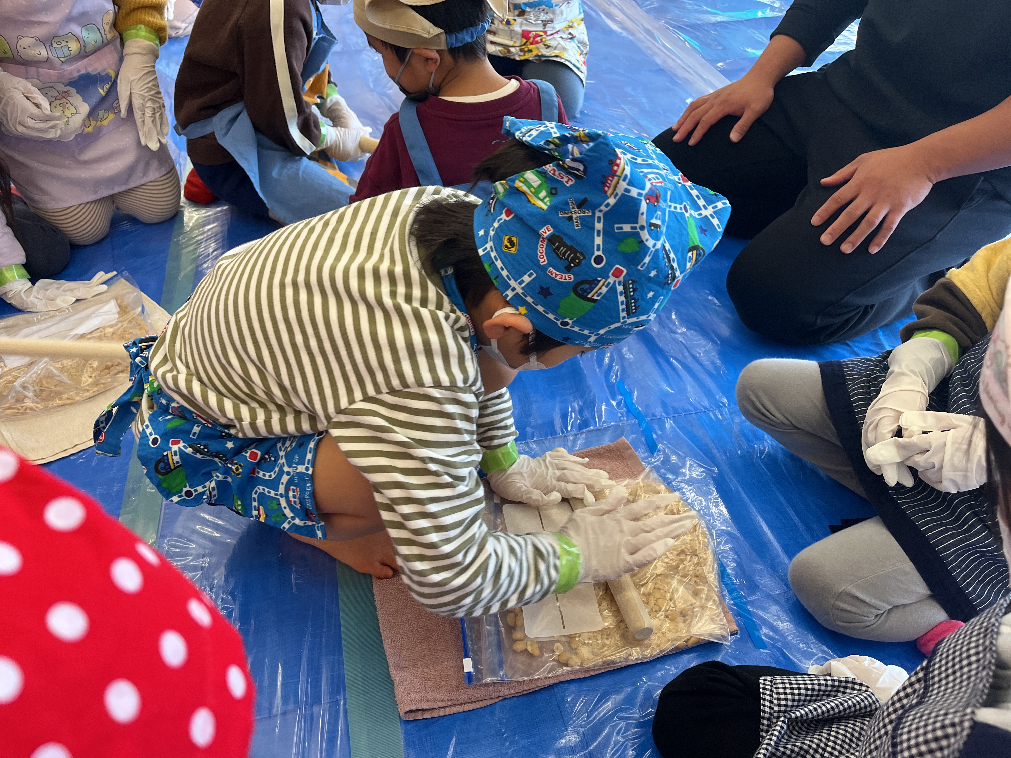 - お友だちと交代しながら、様々な方法で大豆を潰しました。