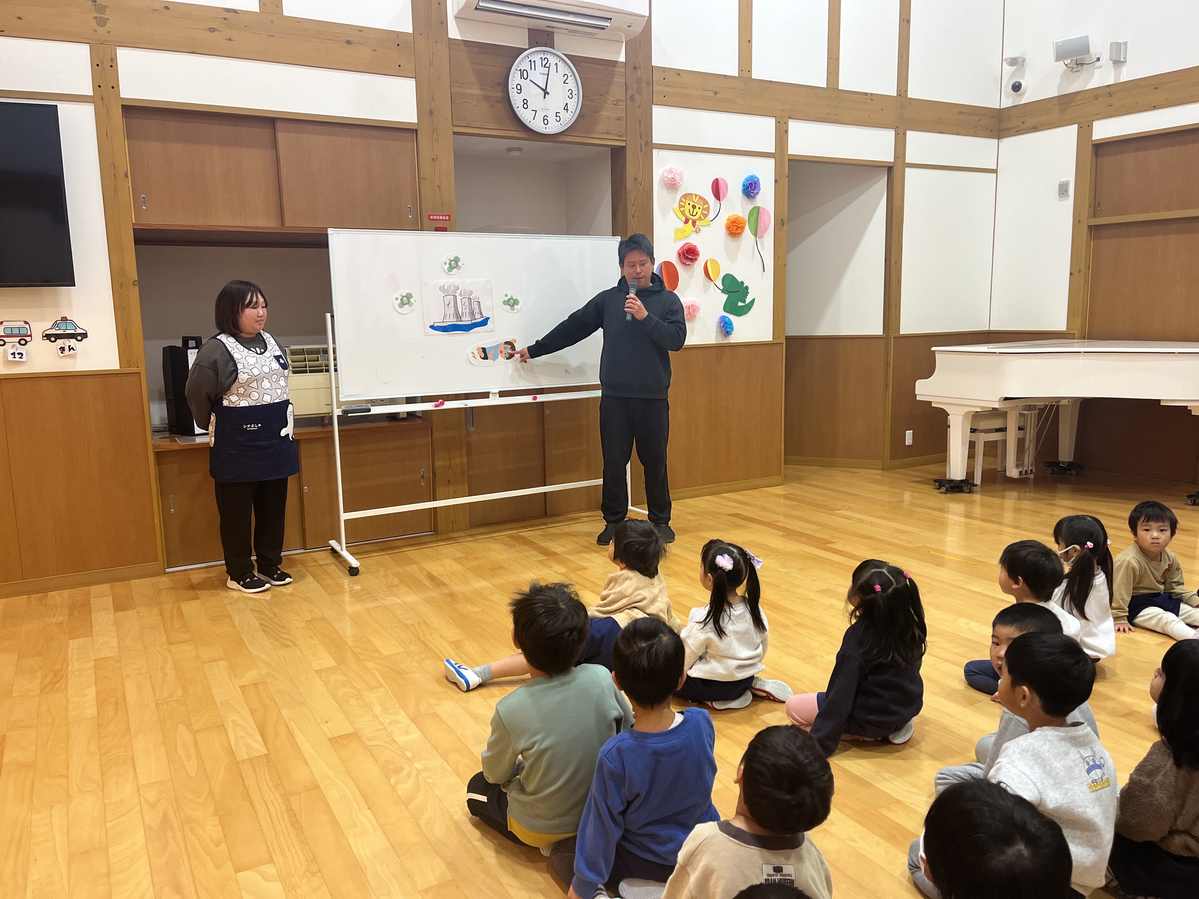 - 保護者の方にもホールに集まり、原発のことや事故があったらどうするのかの話を聞きました。