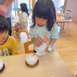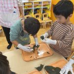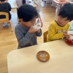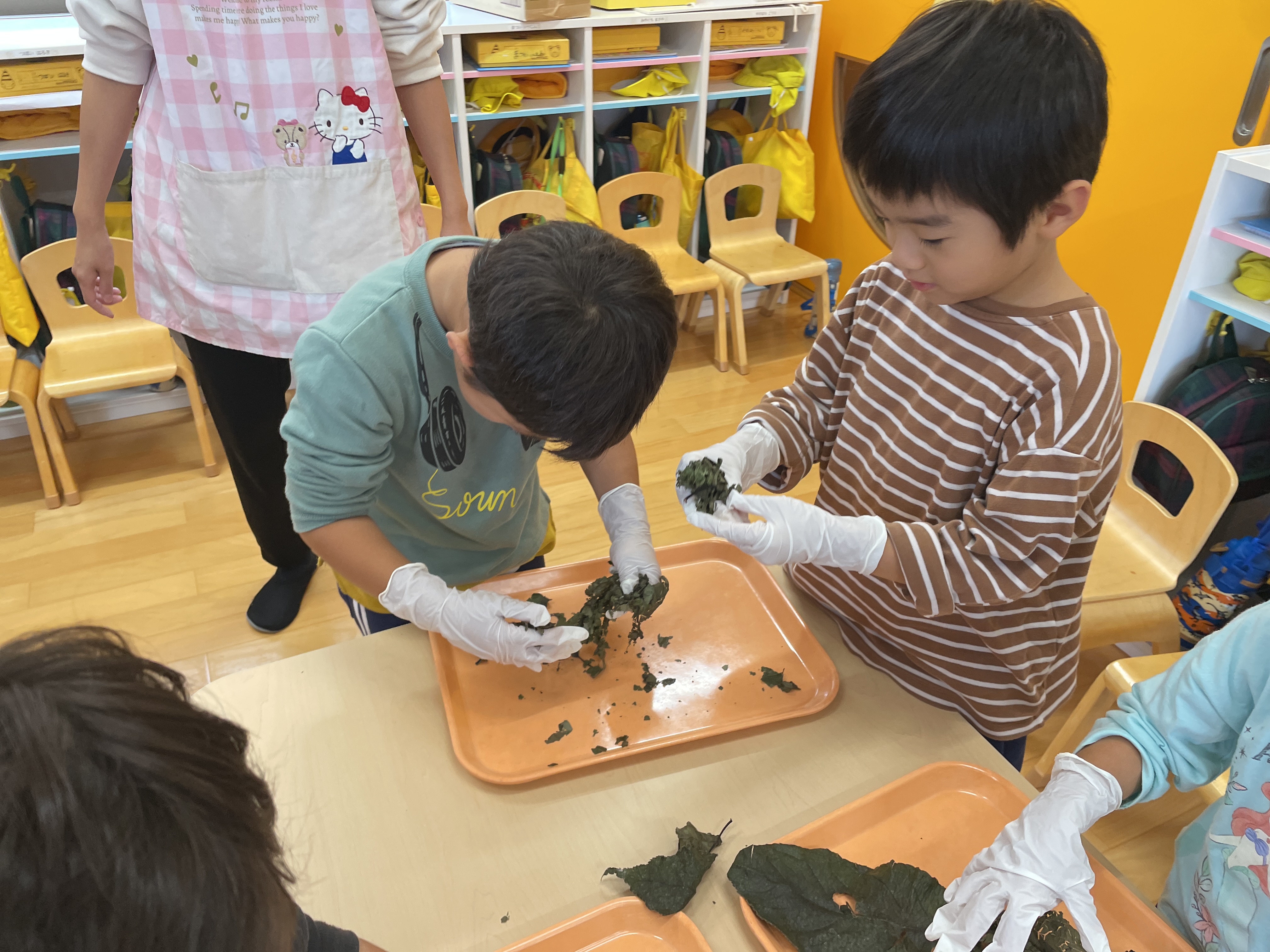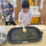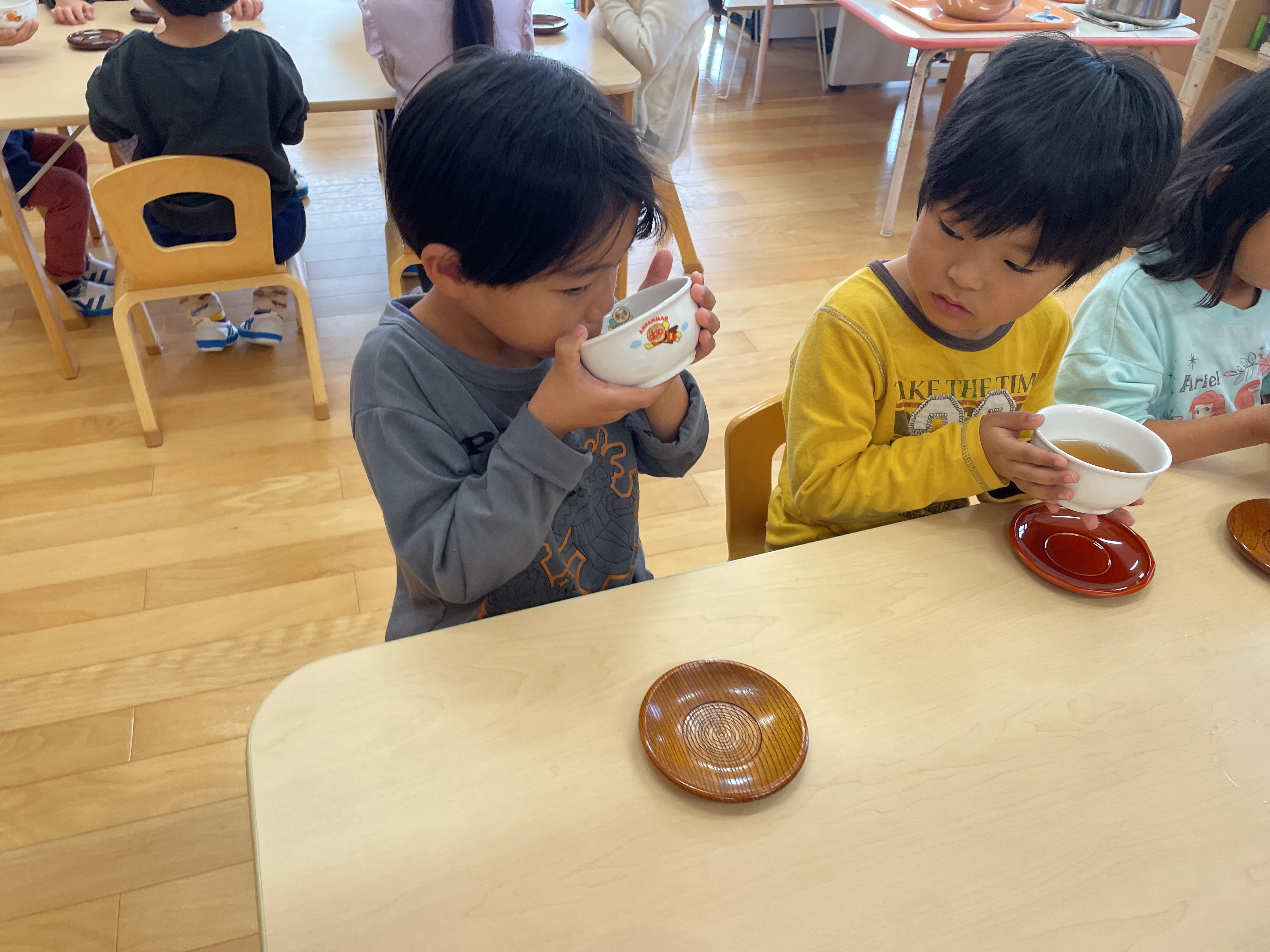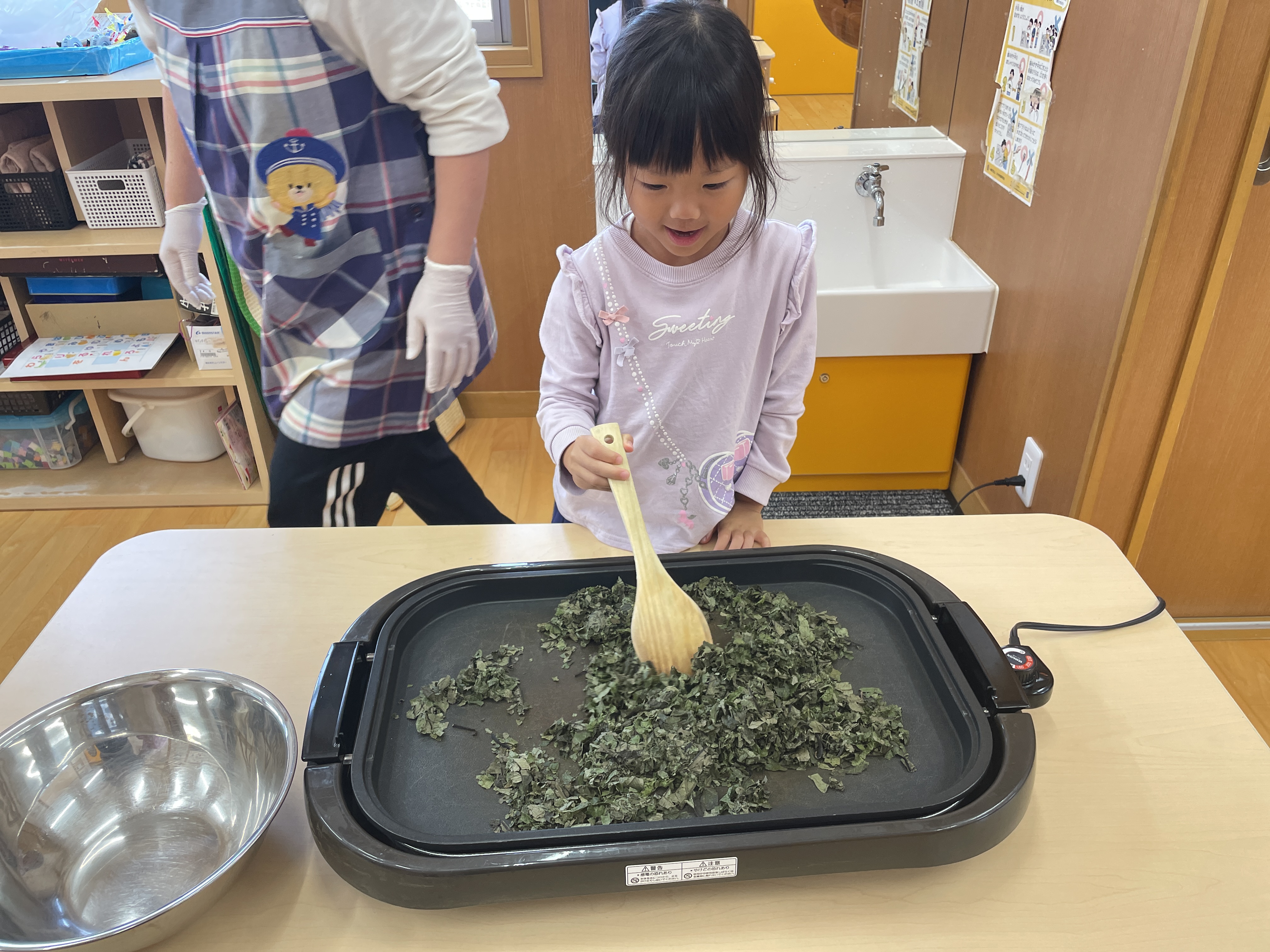 2025.11.07 杜仲茶葉焙煎 11月5日(水)に、きりん組が杜仲茶葉の焙煎を行いました。 乾燥させた杜仲茶葉を、手で細かくしました。 粉々になった茶葉をホットプレートで煎りました。いい匂いがしてきて、子どもたちは嬉しそうでした。 煎った茶葉を急須に入れて、お茶にして飲みました。 「おいしい!」と喜んで飲んでいました。