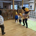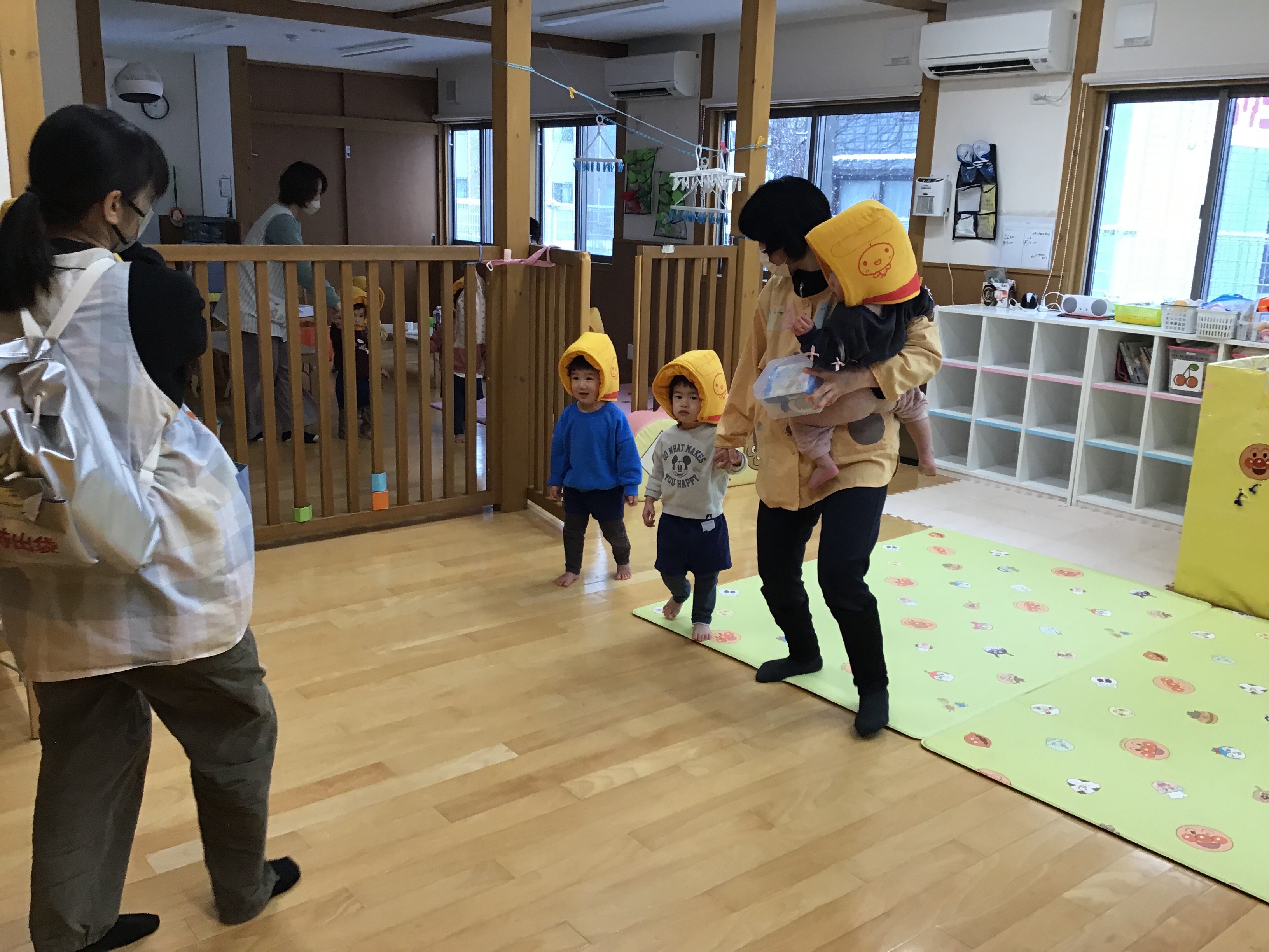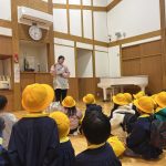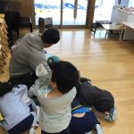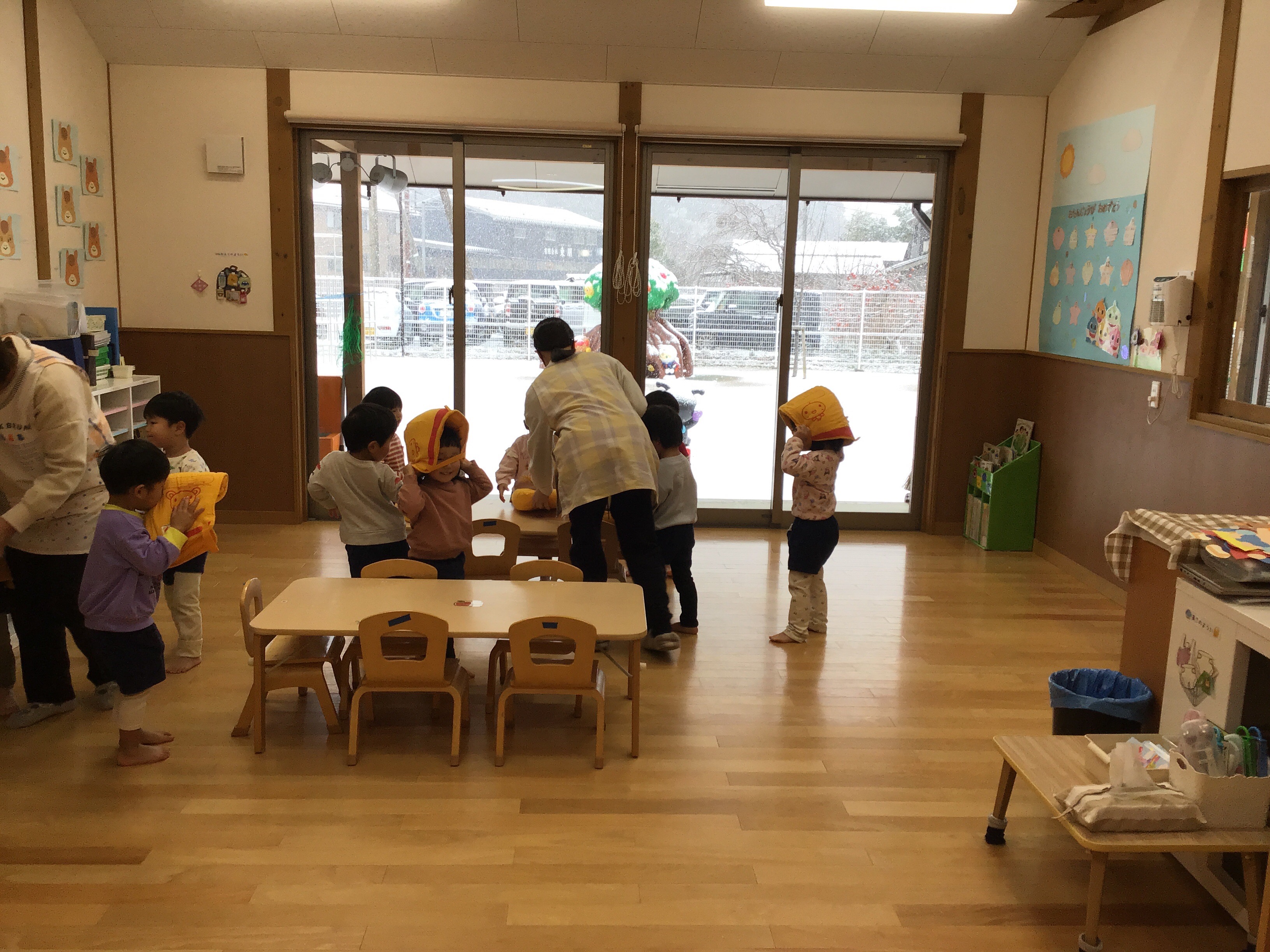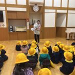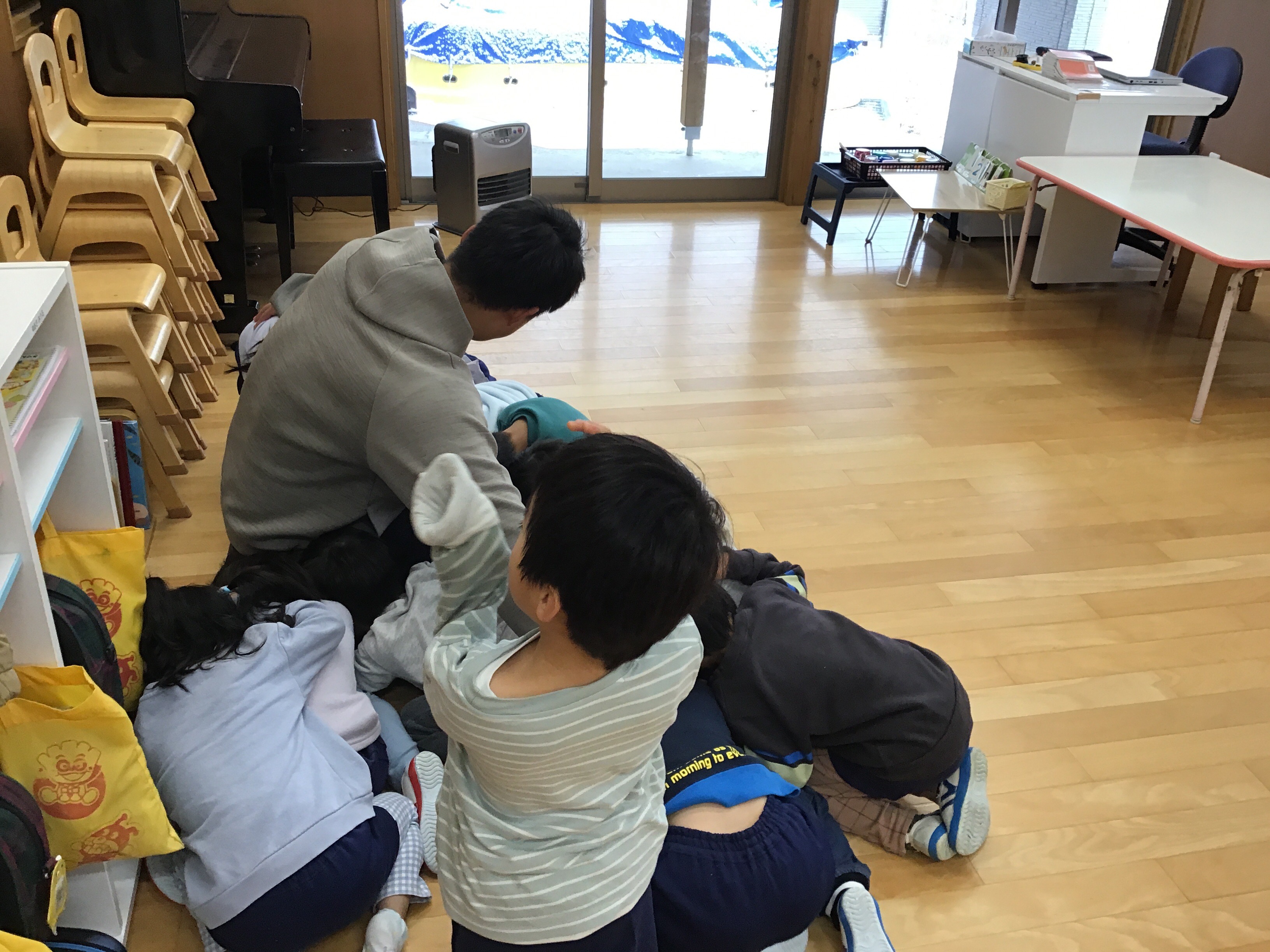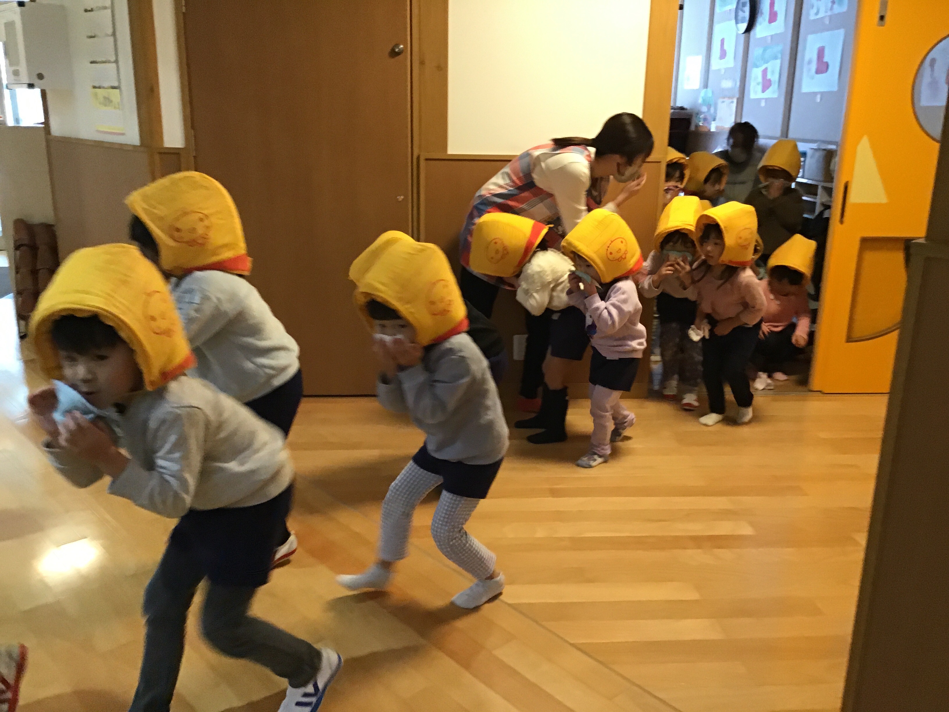 - 地震発生の放送が流れると、素早く頭を守ったり保育教諭の近くに集まったりしていました。