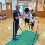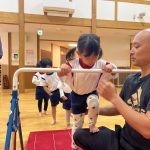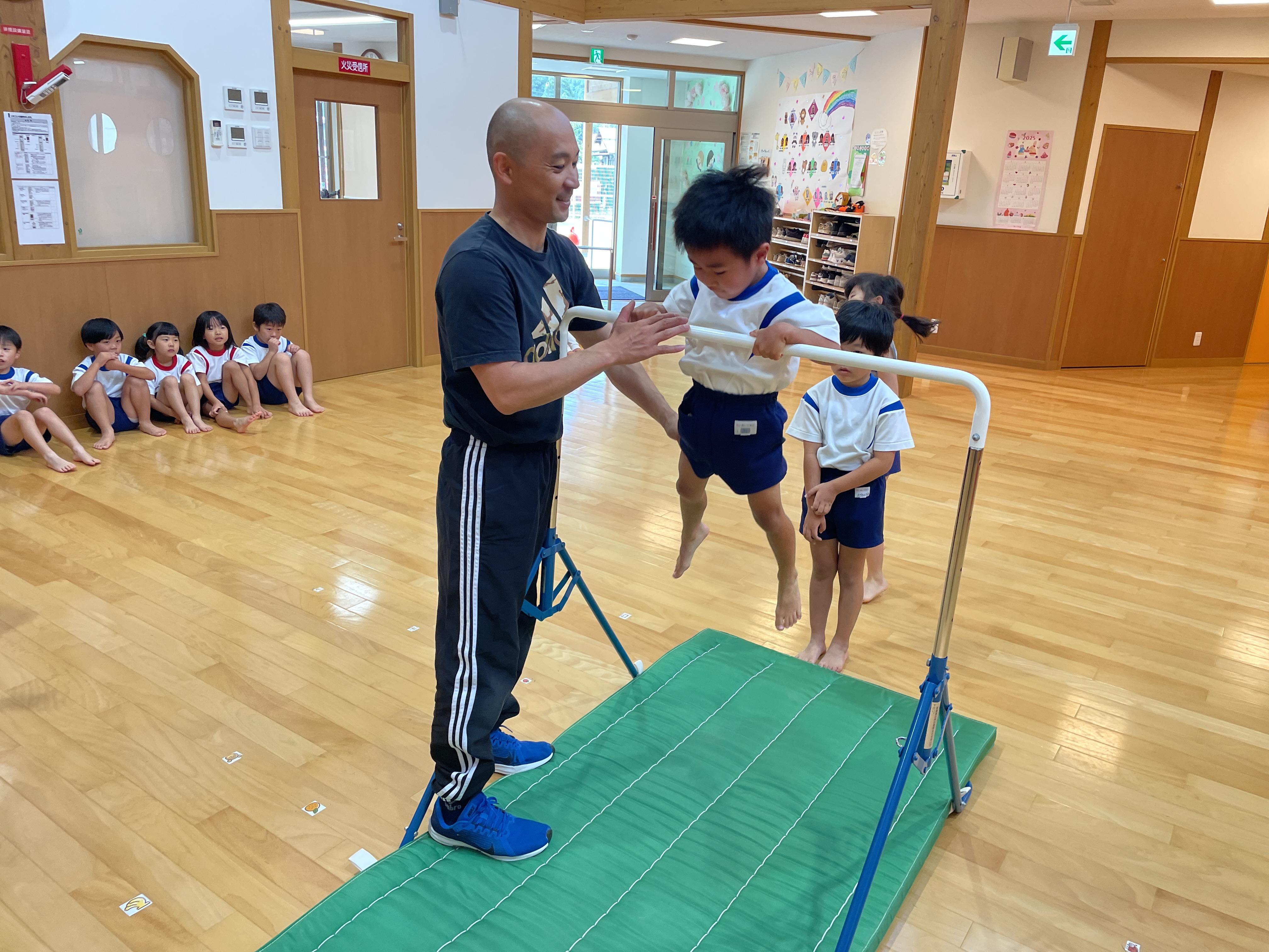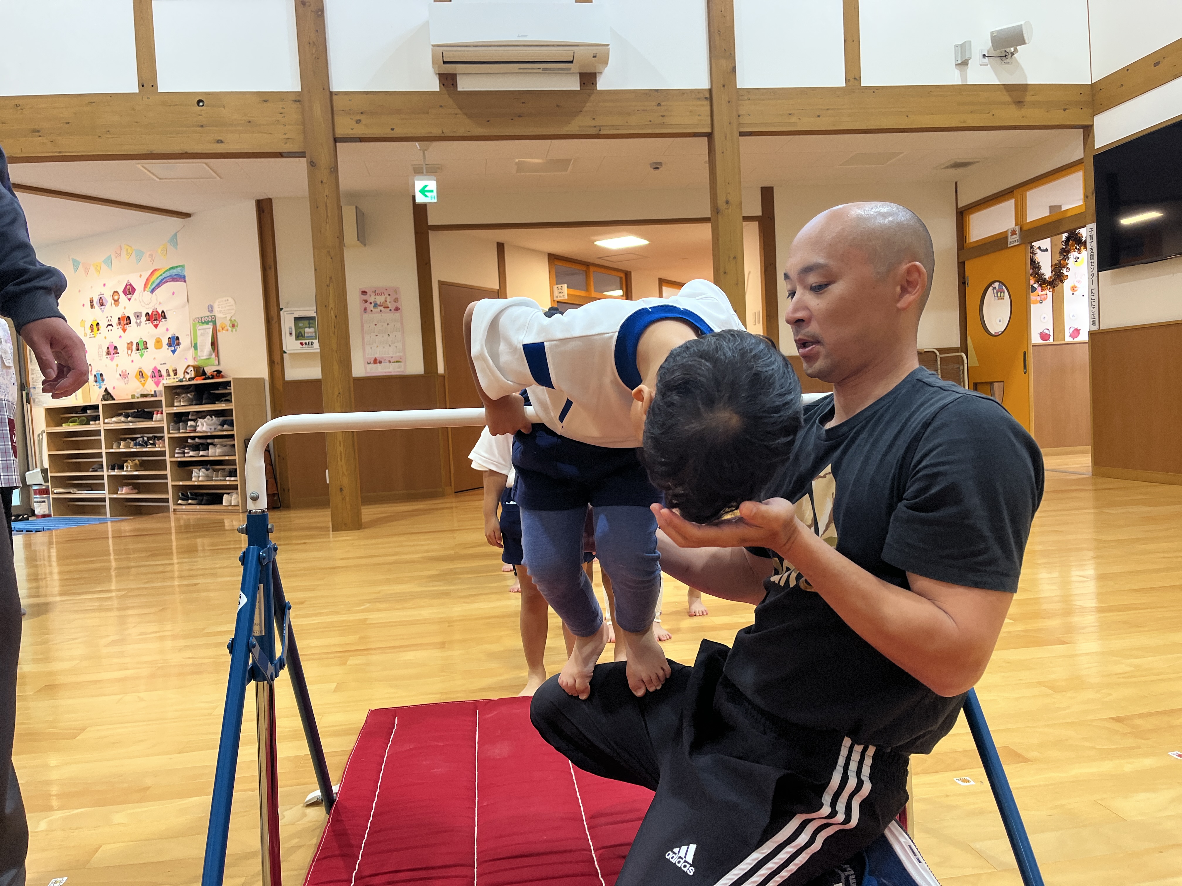 - 最大まで高くした鉄棒で前回りや逆上がりをしました。いつもと違う鉄棒に大喜びで取り組んでいました。