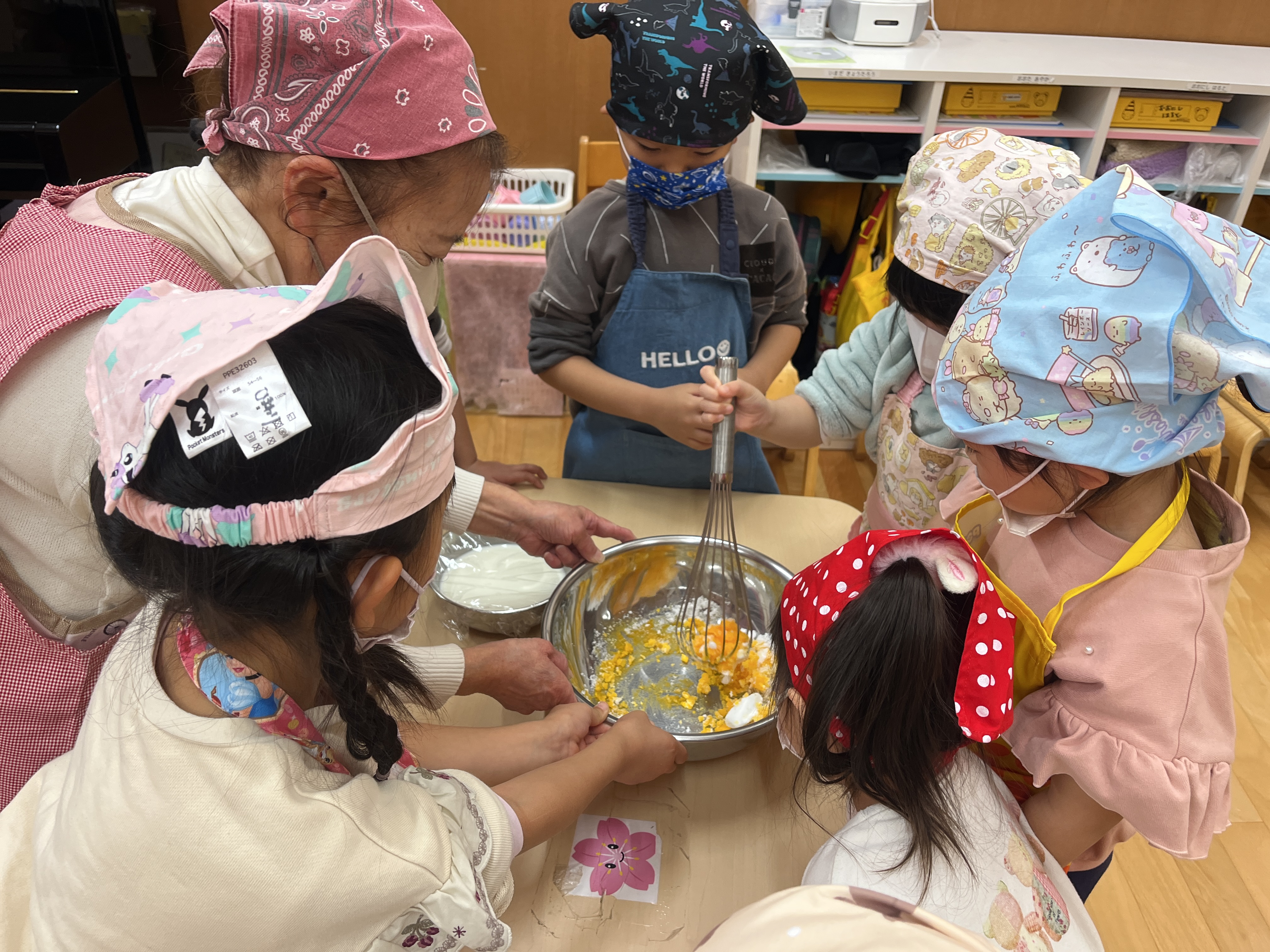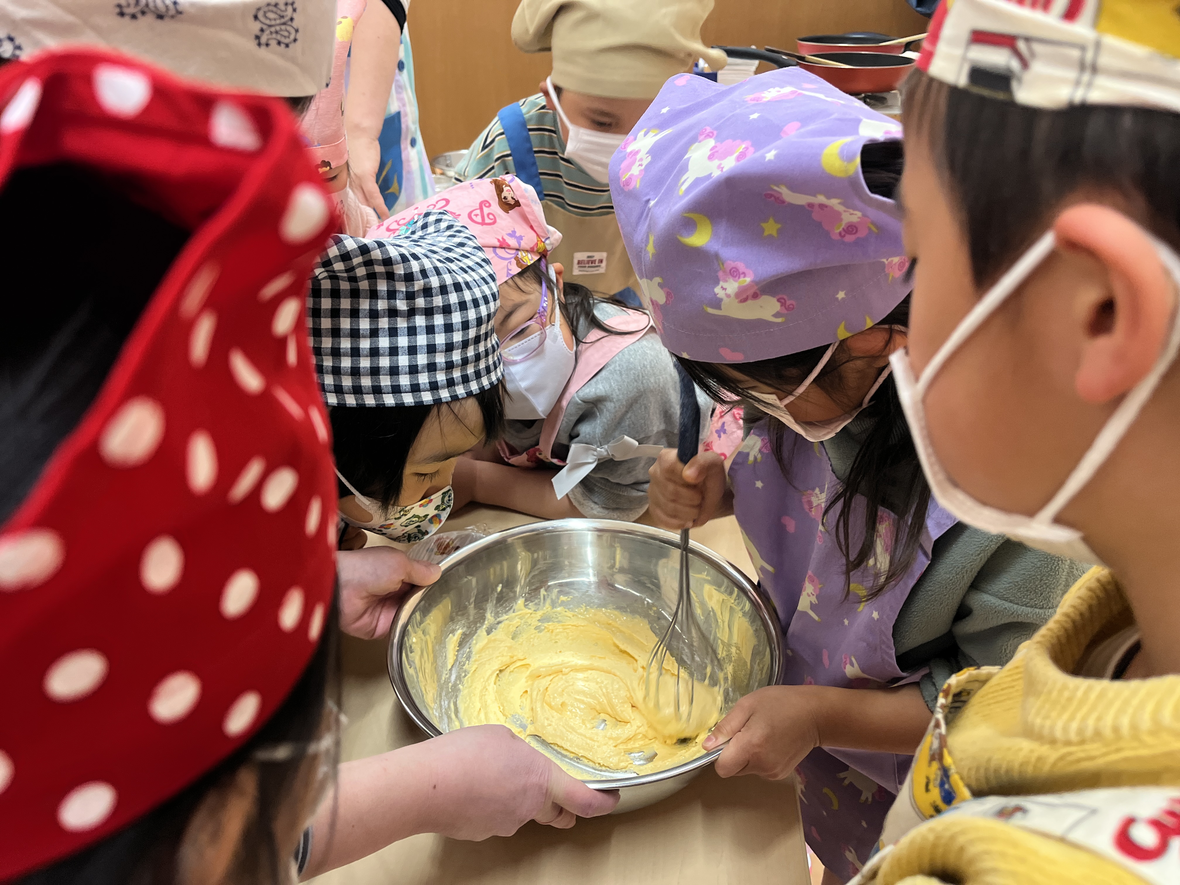 - みんなで協力して混ぜ合わせました。だんだん色が変わり、子どもたちは興味津々でした。