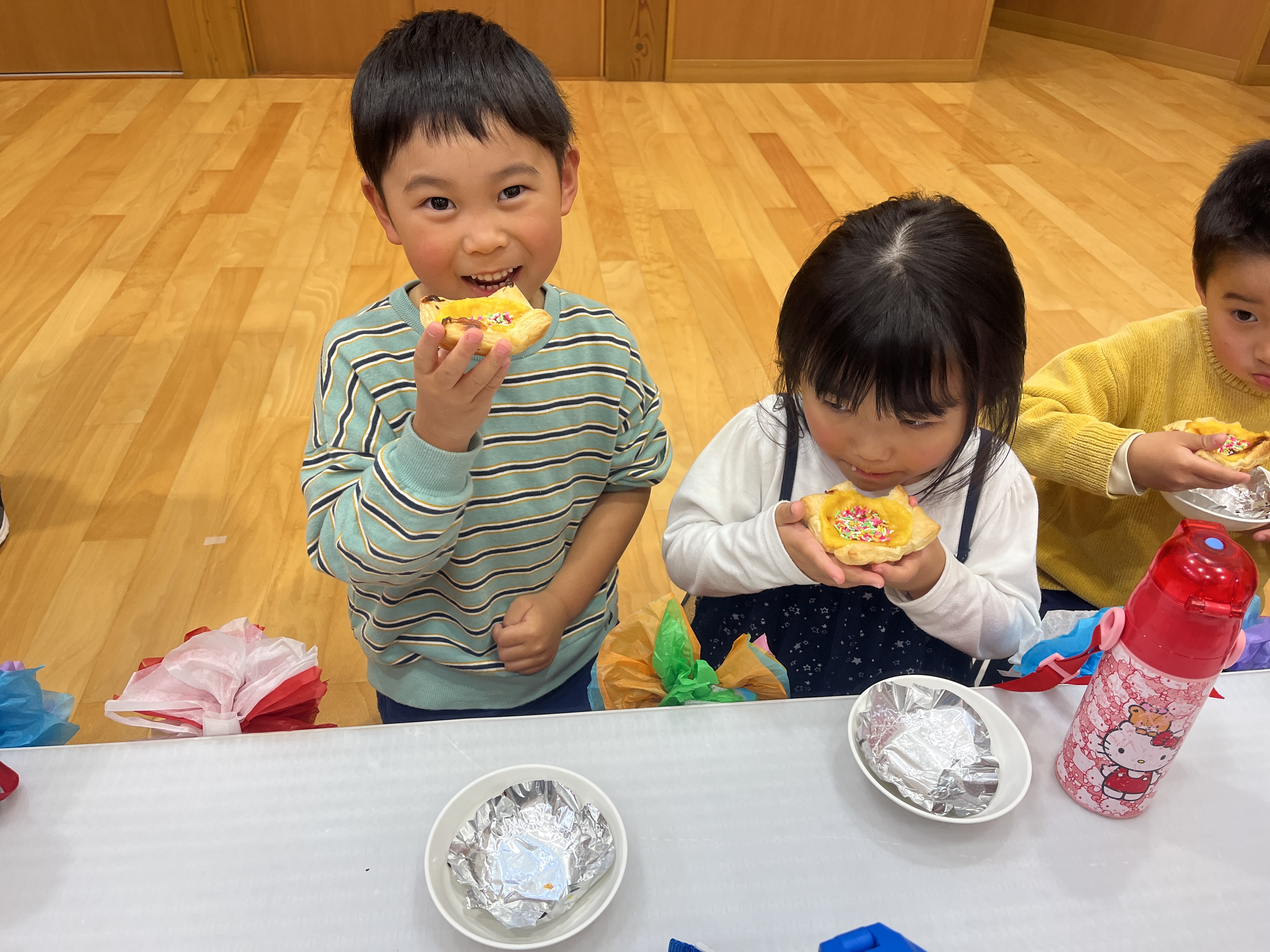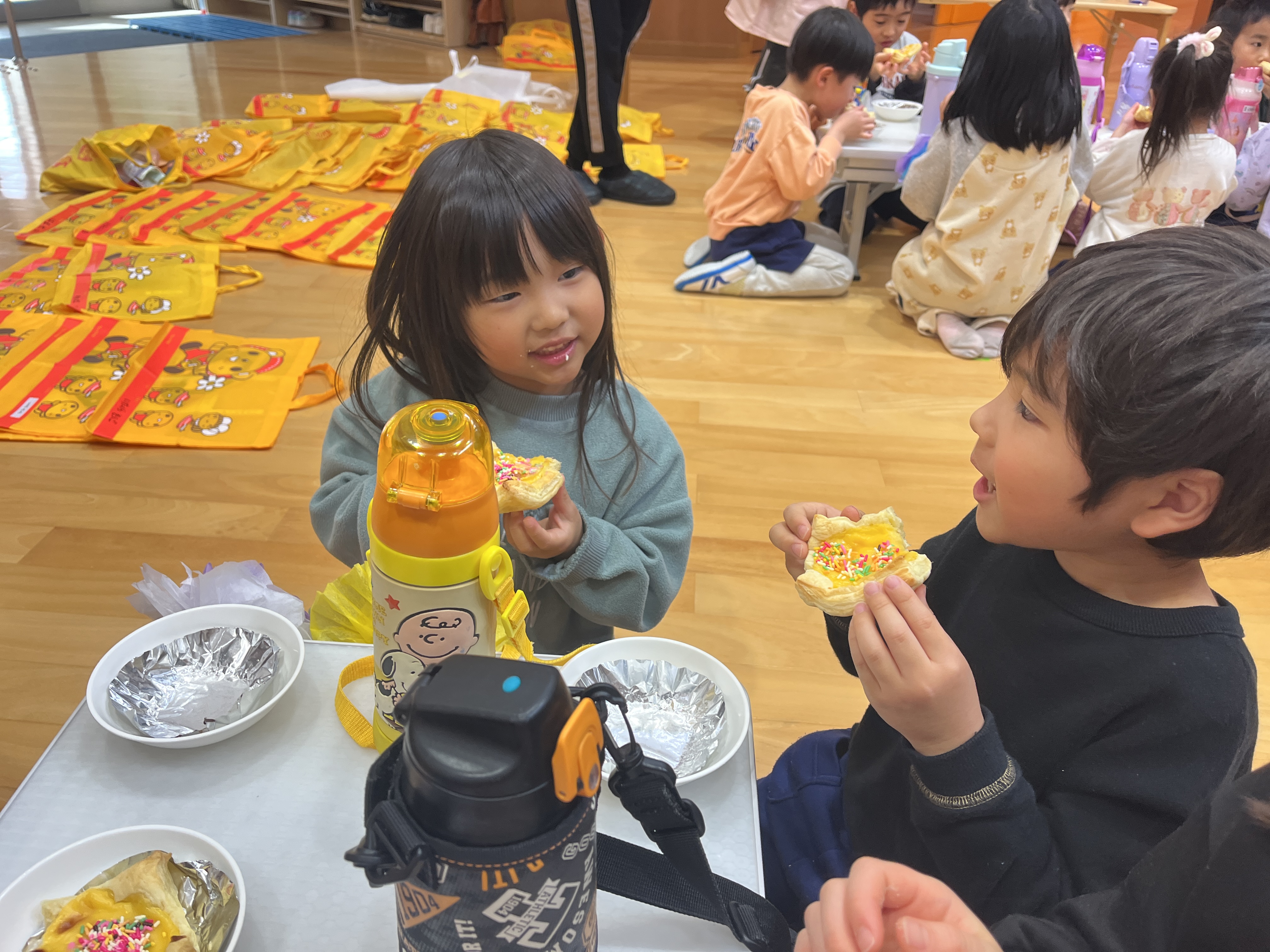 - ホールで一緒におやつでいただきました。「おいしい!」と話しながらあっという間に食べていました。