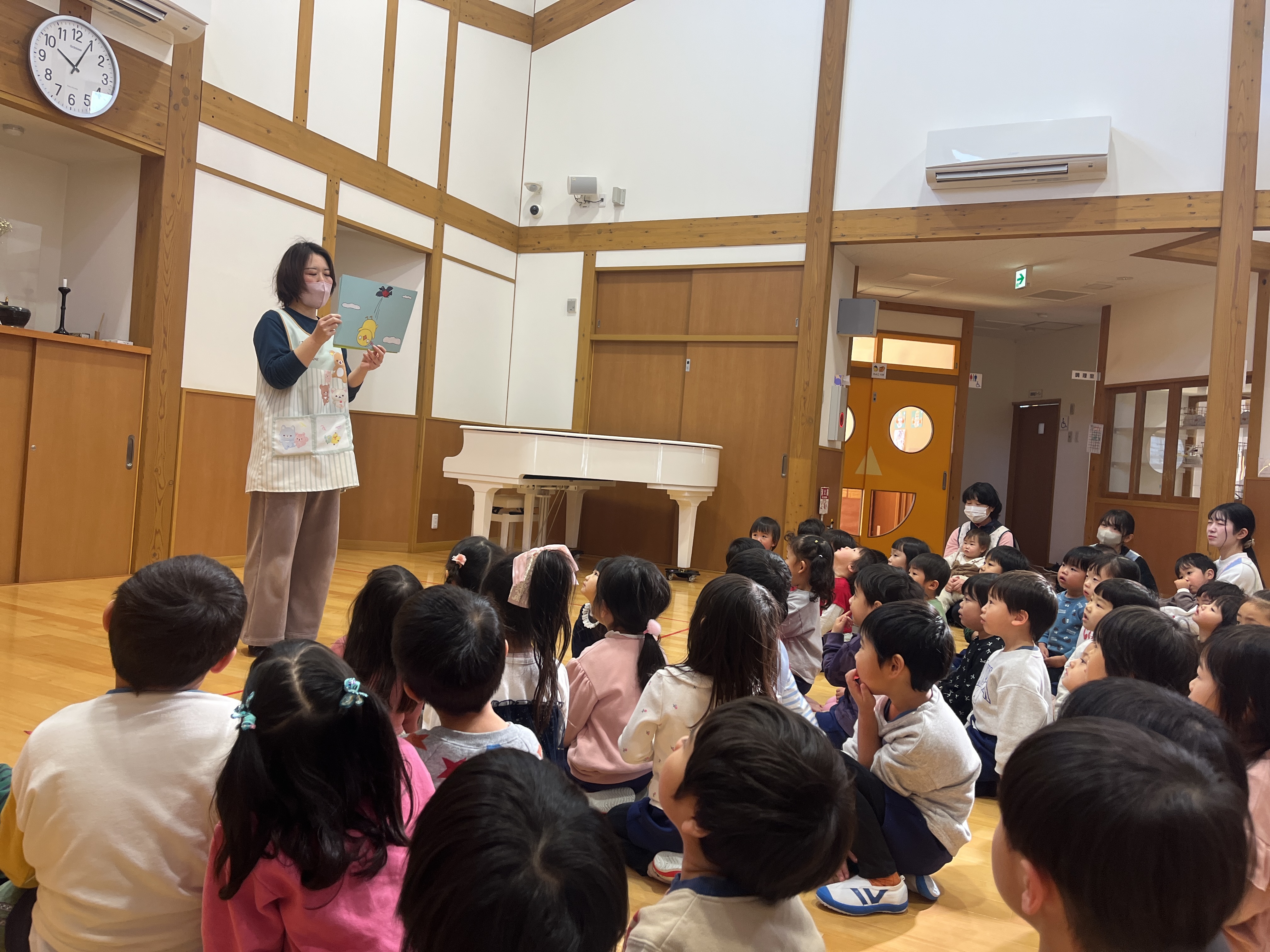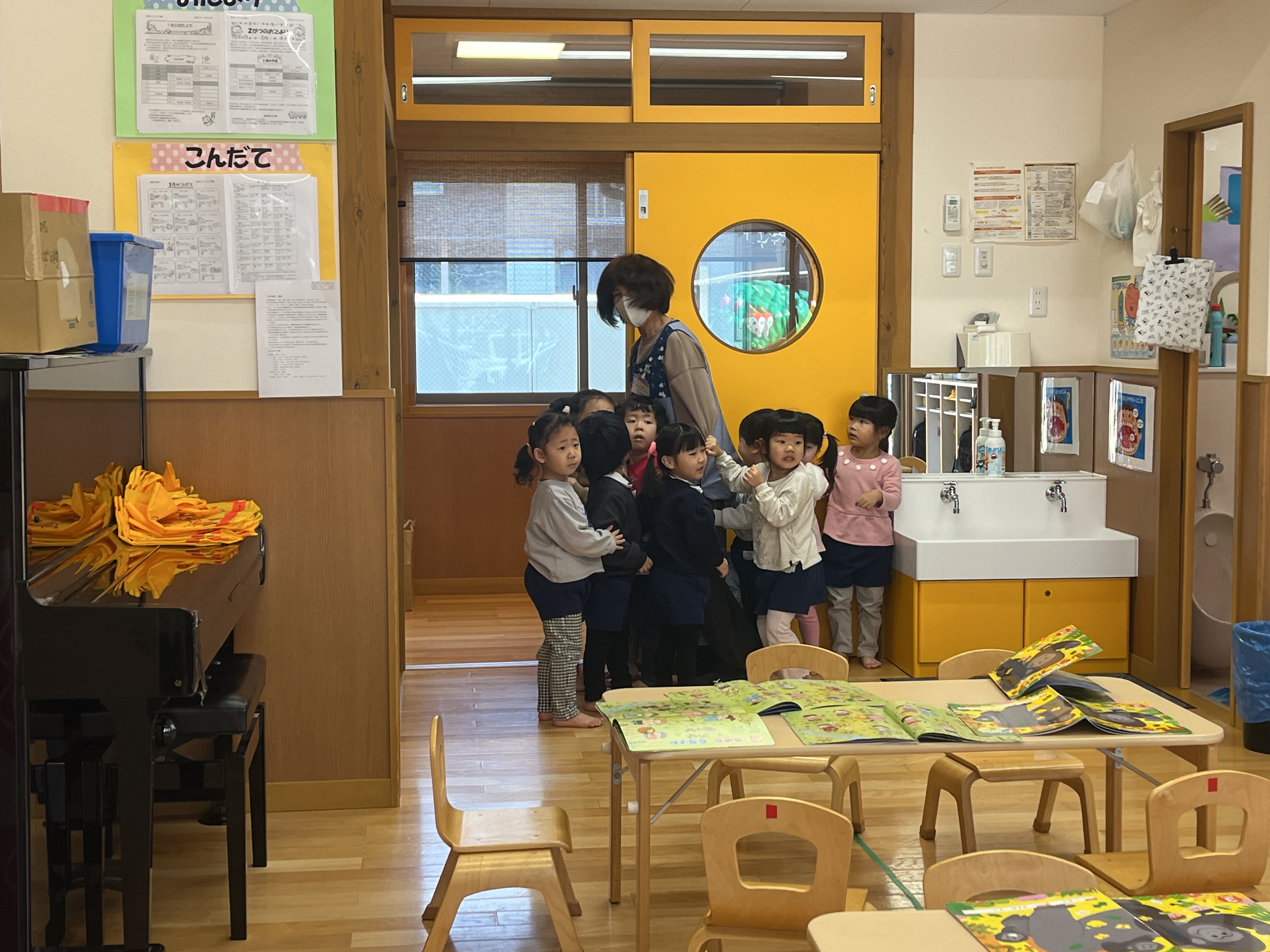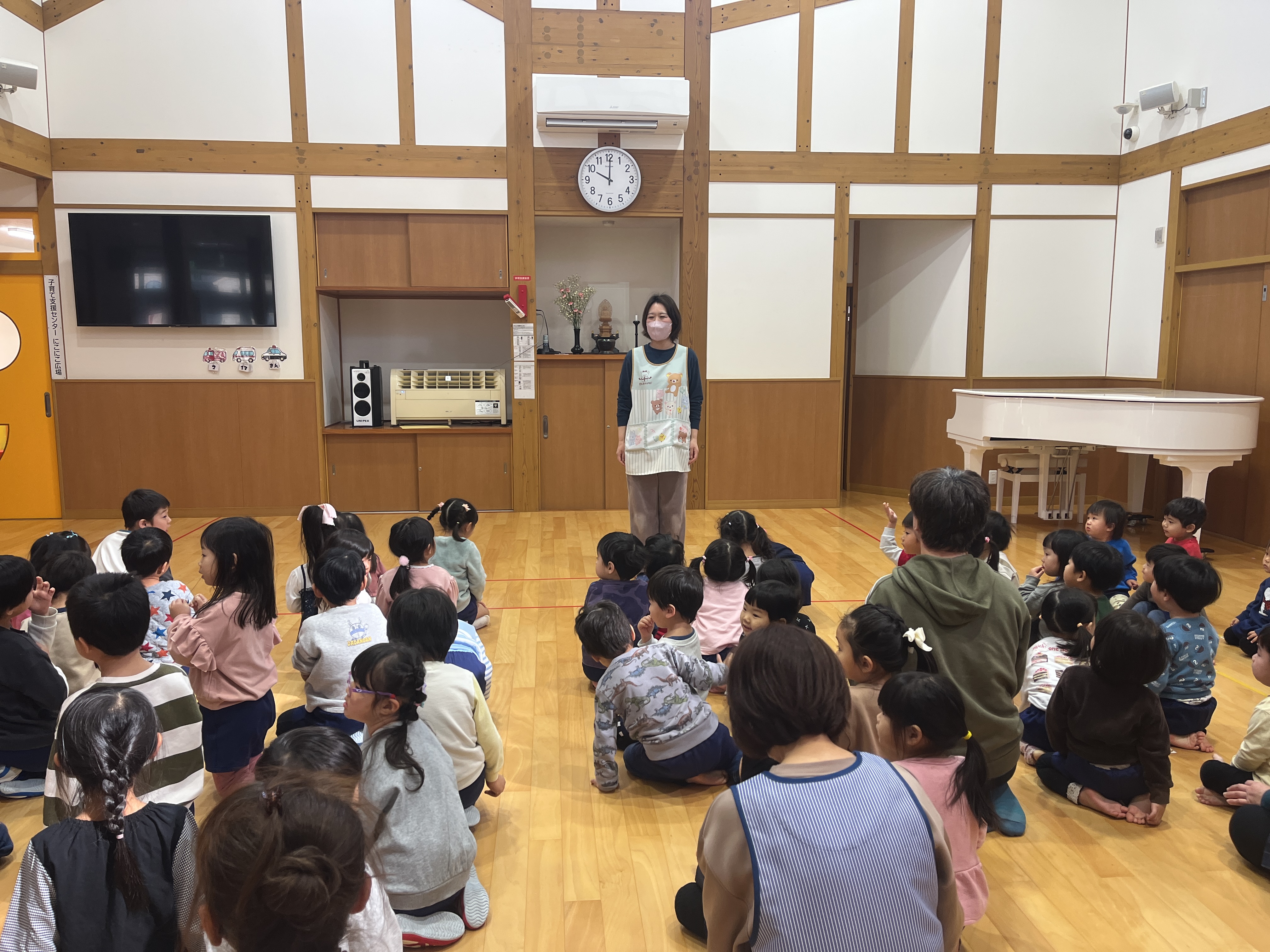 - 園庭に不審者が現れ、防犯ブザーや放送が流れると、素早く保育教諭のもとに集まっていました。