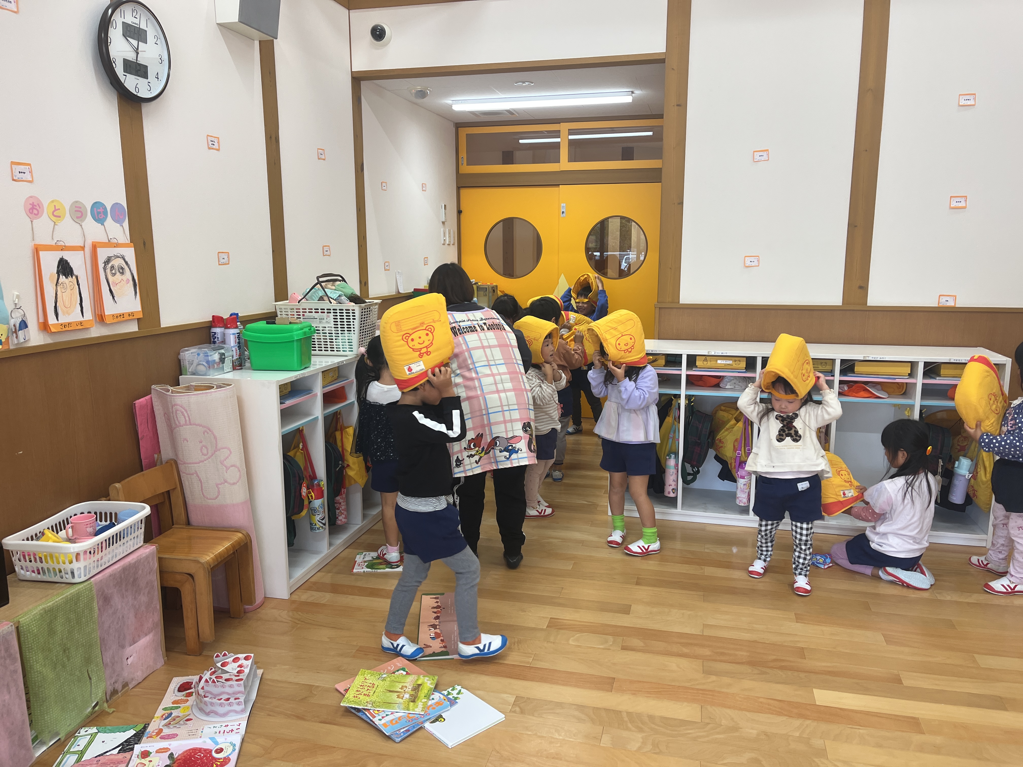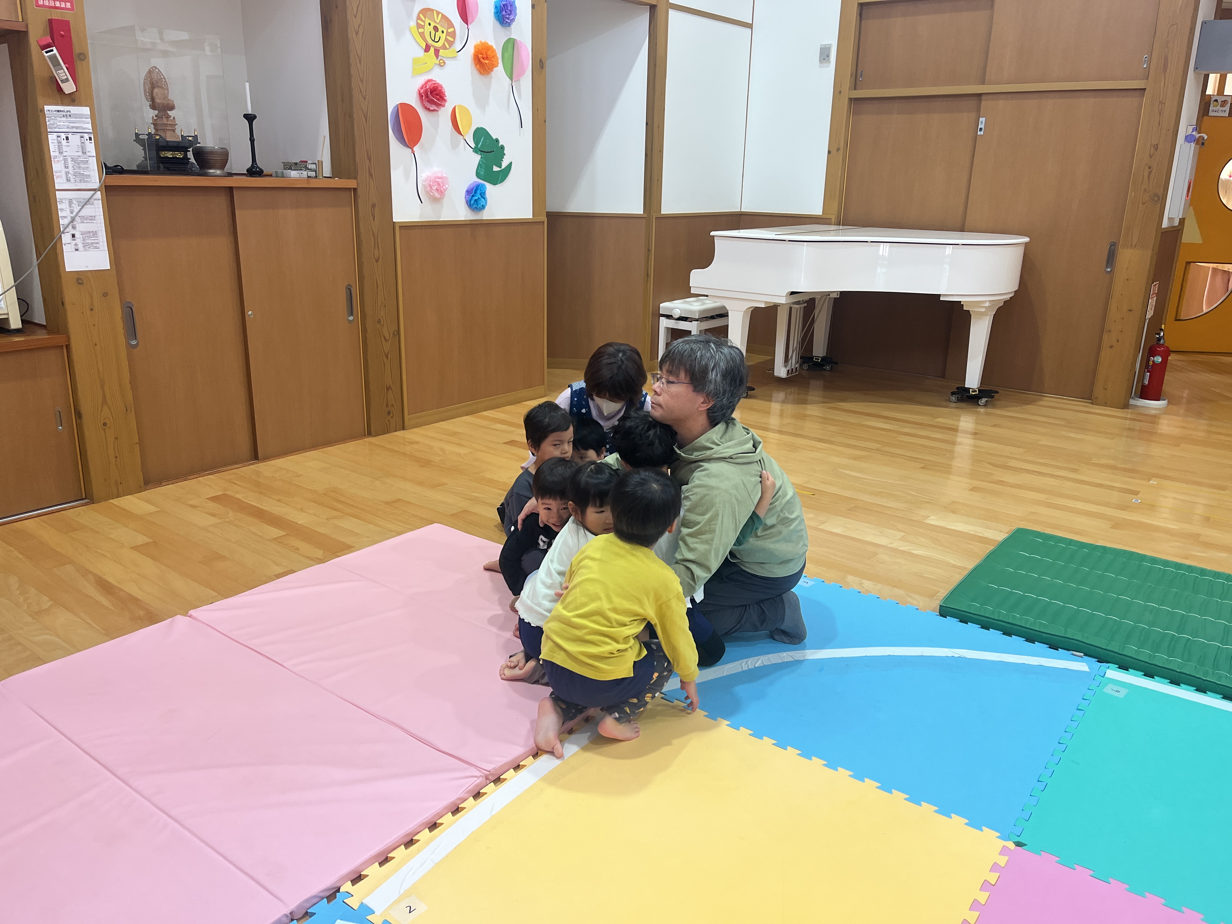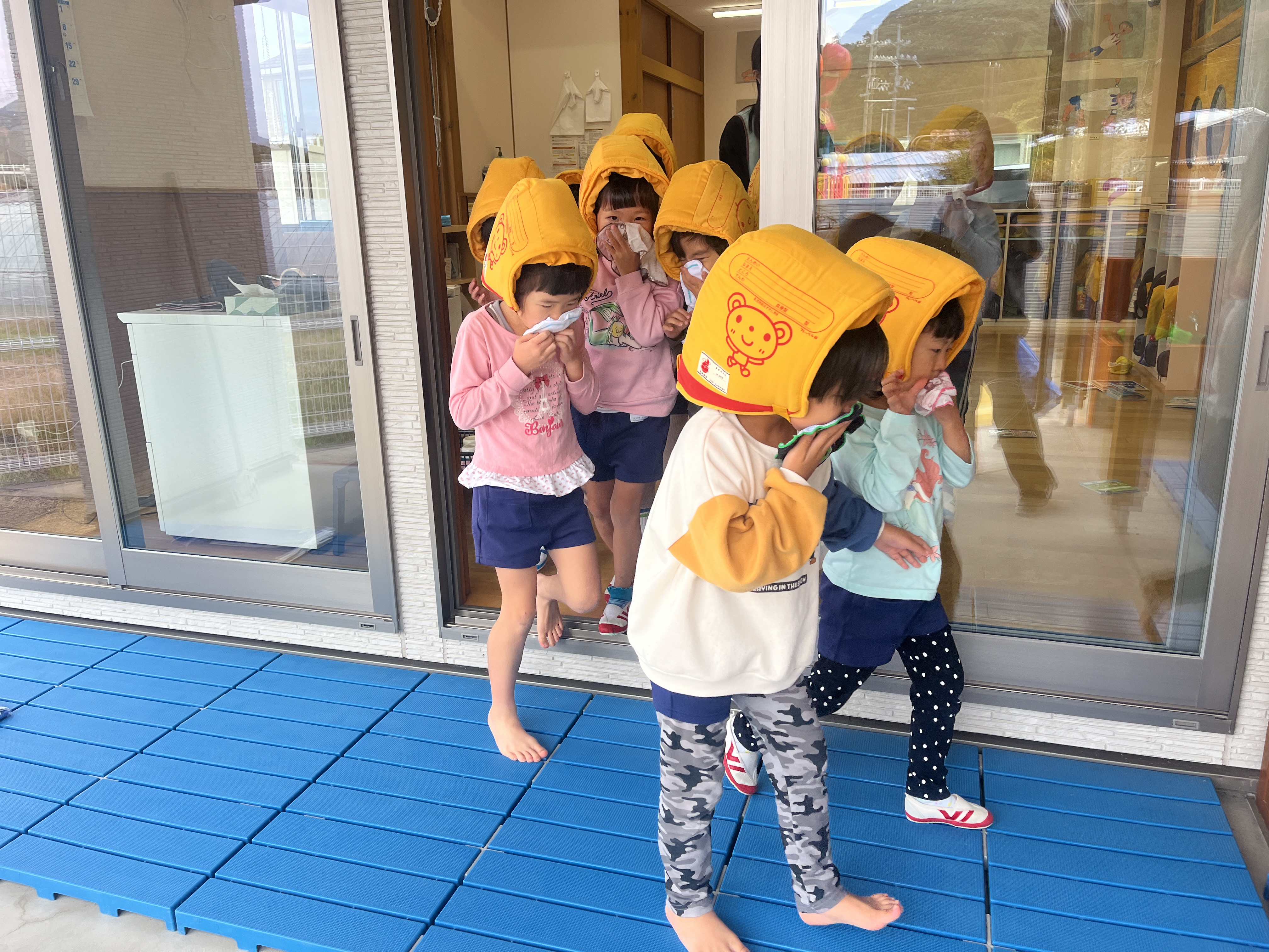 - 地震発生の放送が流れると、素早く保育教諭の周りに集まりました。