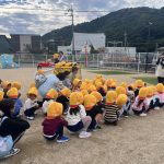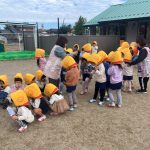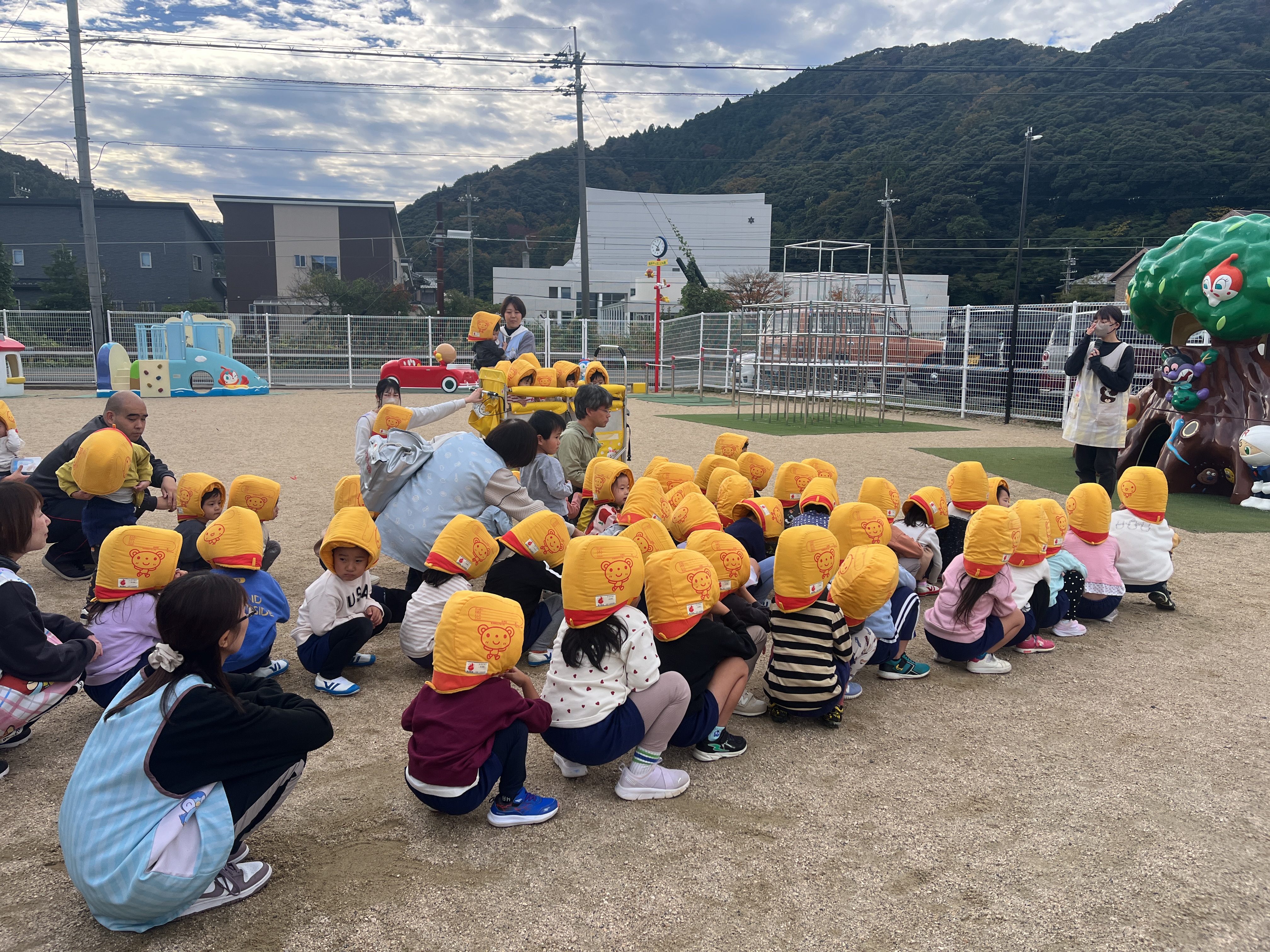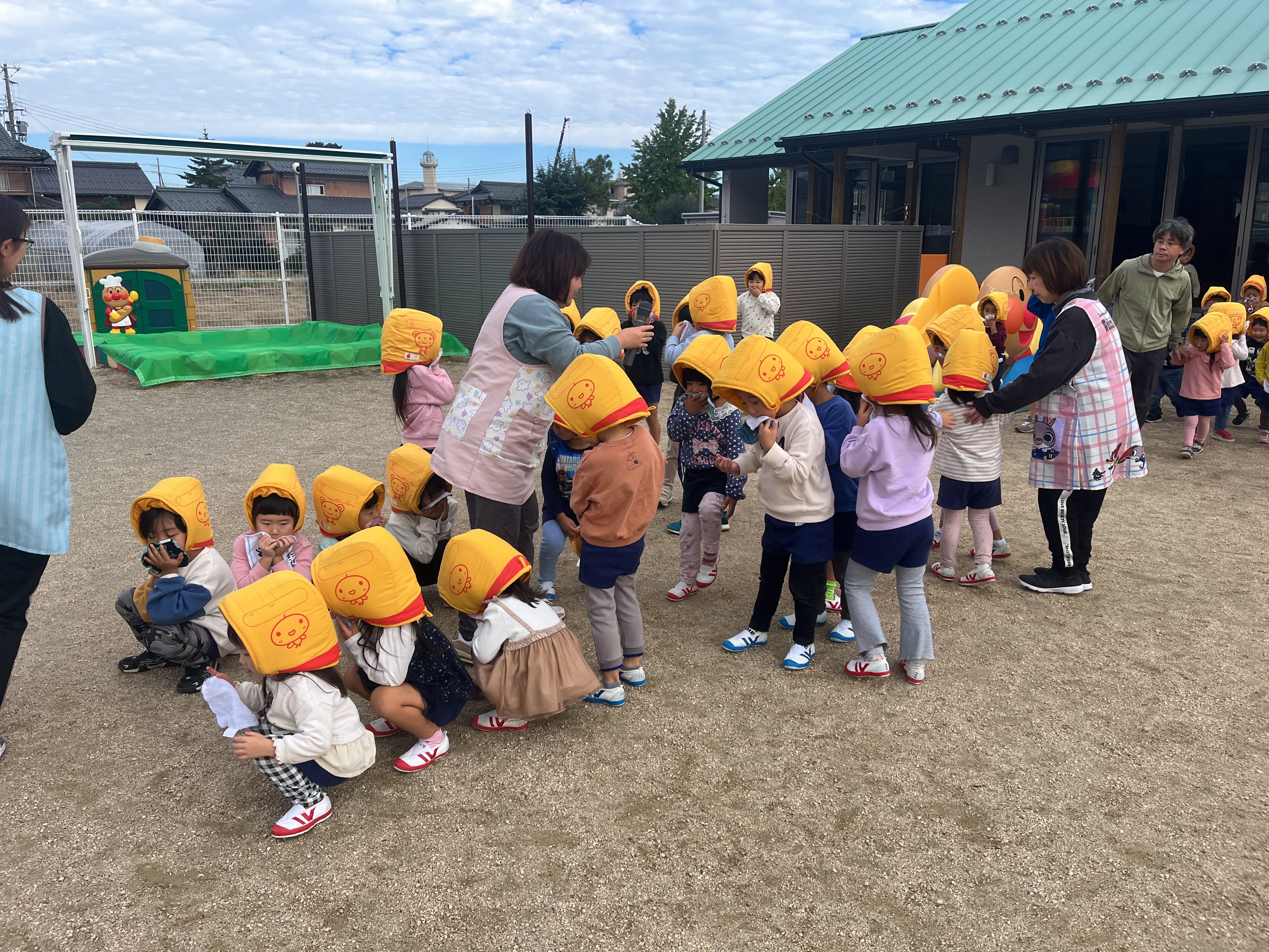 - 給食室から火災発生のベルが鳴り、子どもたちは園庭へ避難しました。