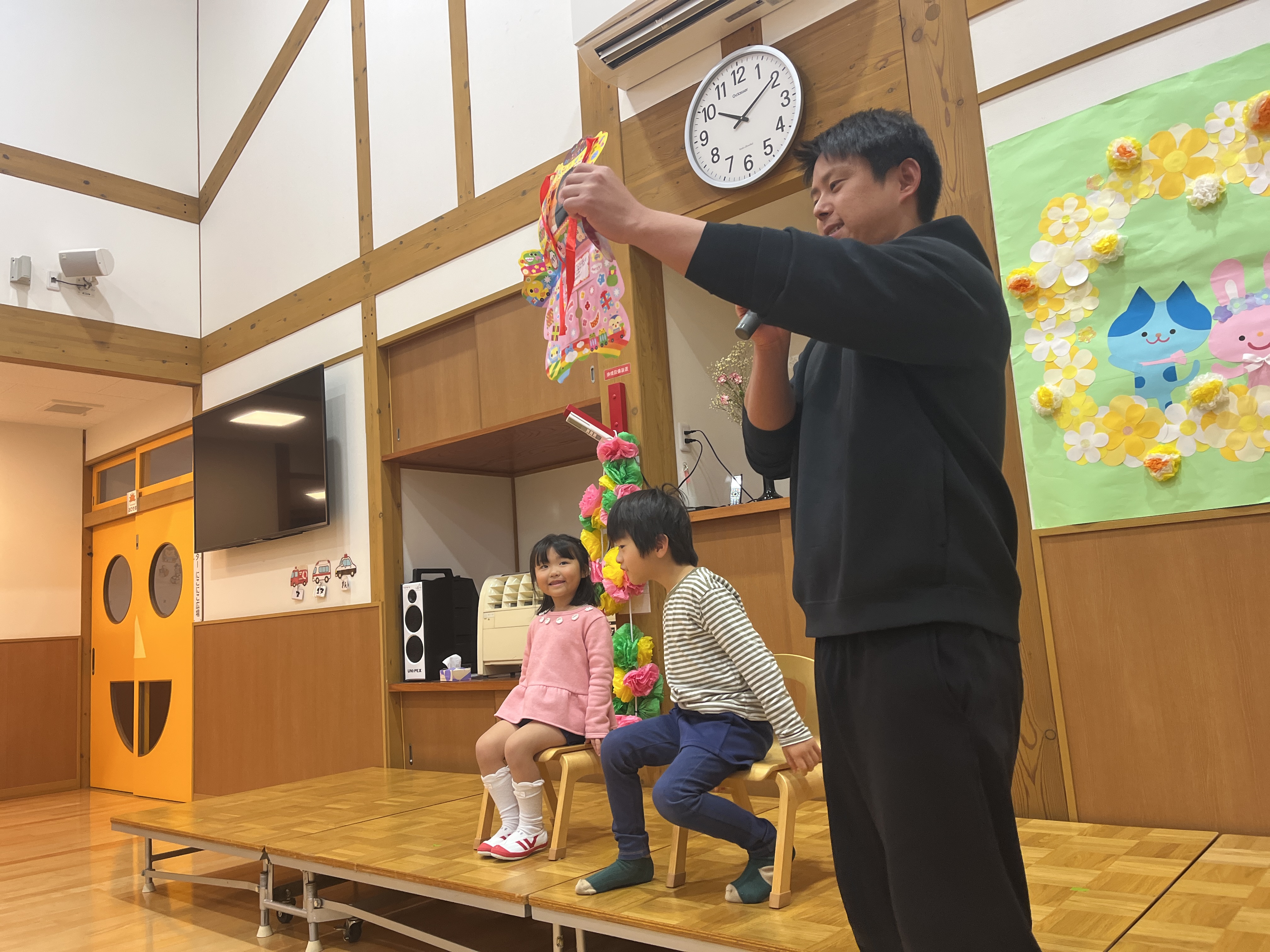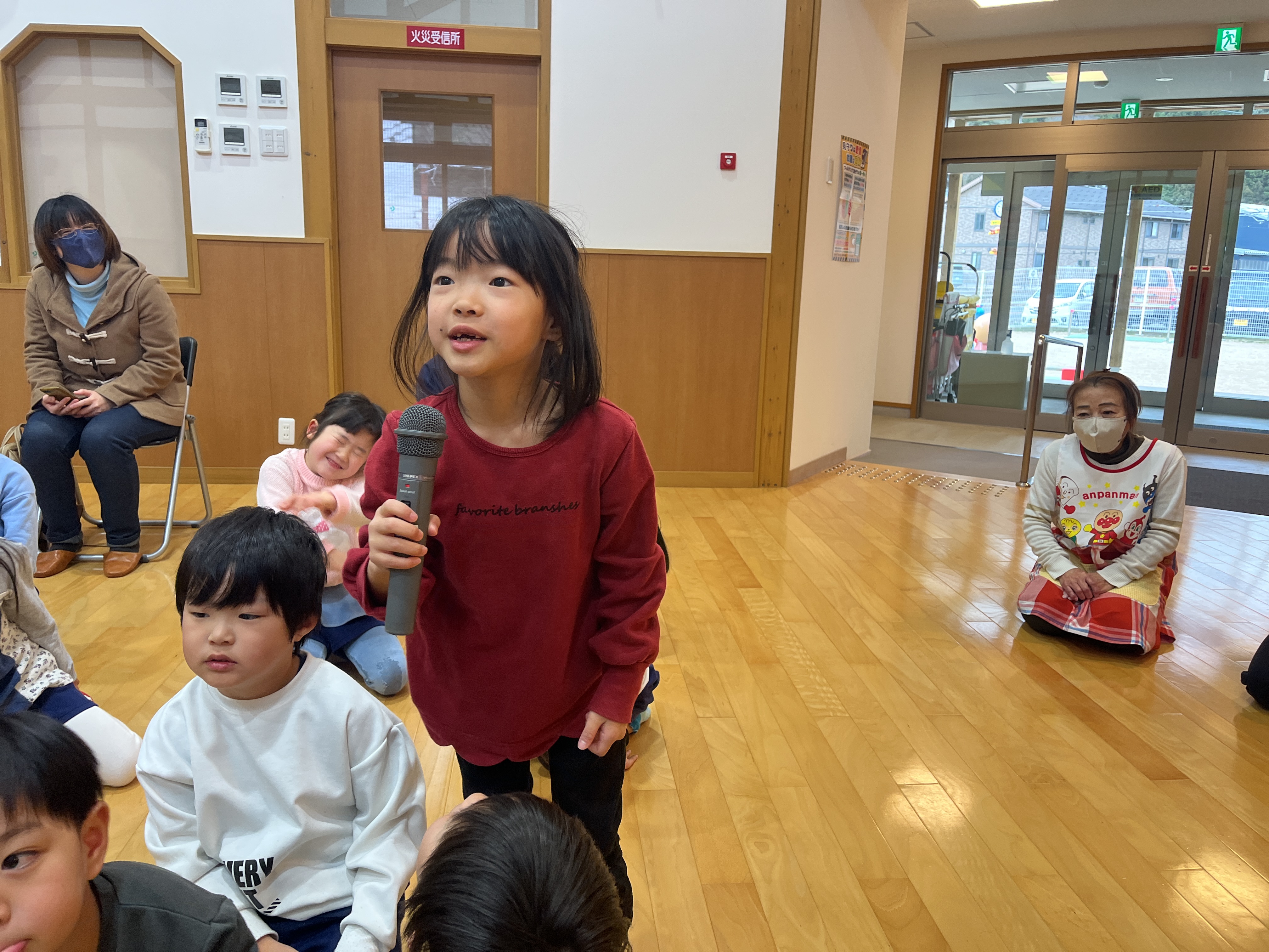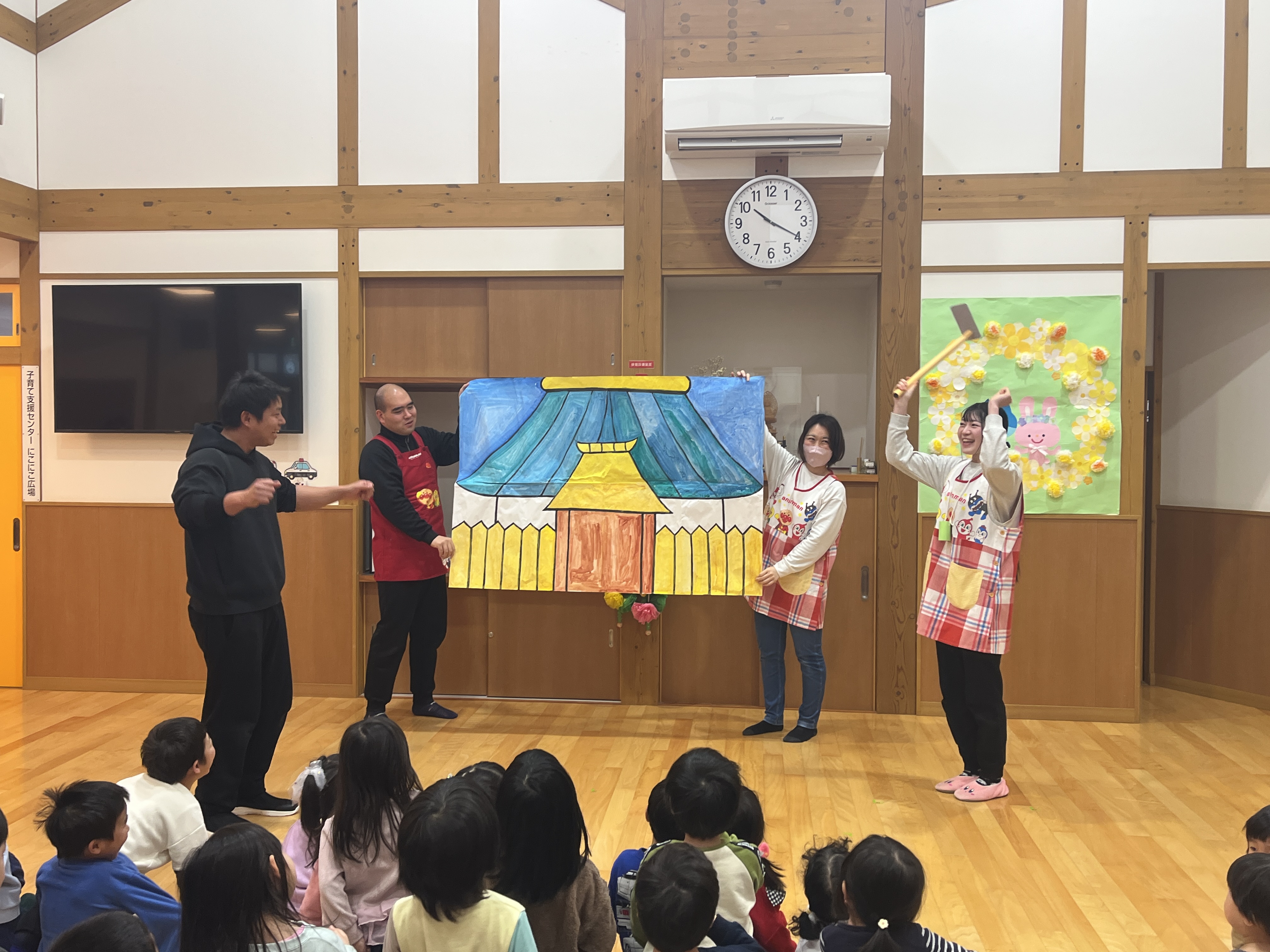 - 職員からの出し物は、発表会でこあら組が行った「わらしべちょうじゃ」の劇をしました。