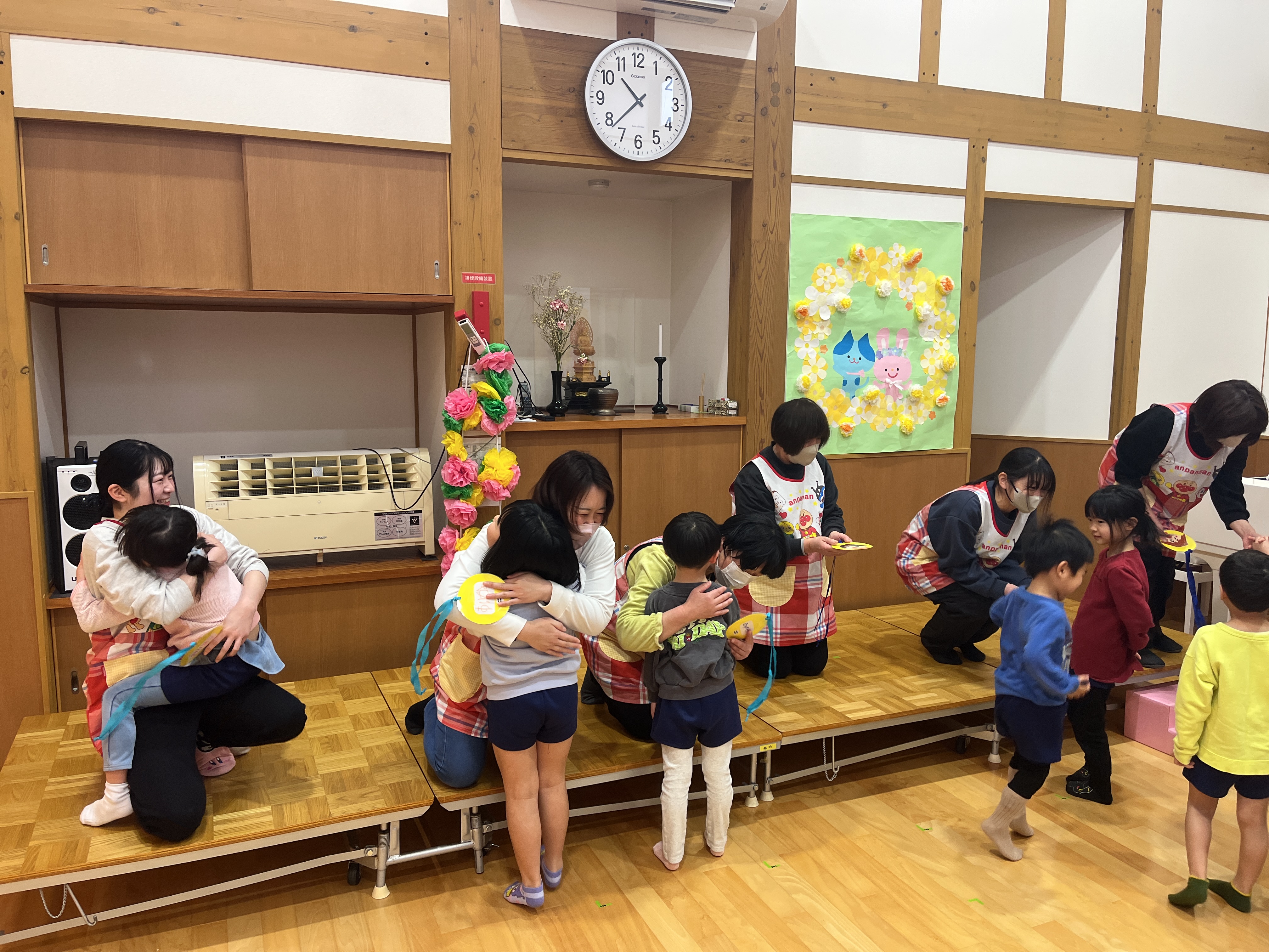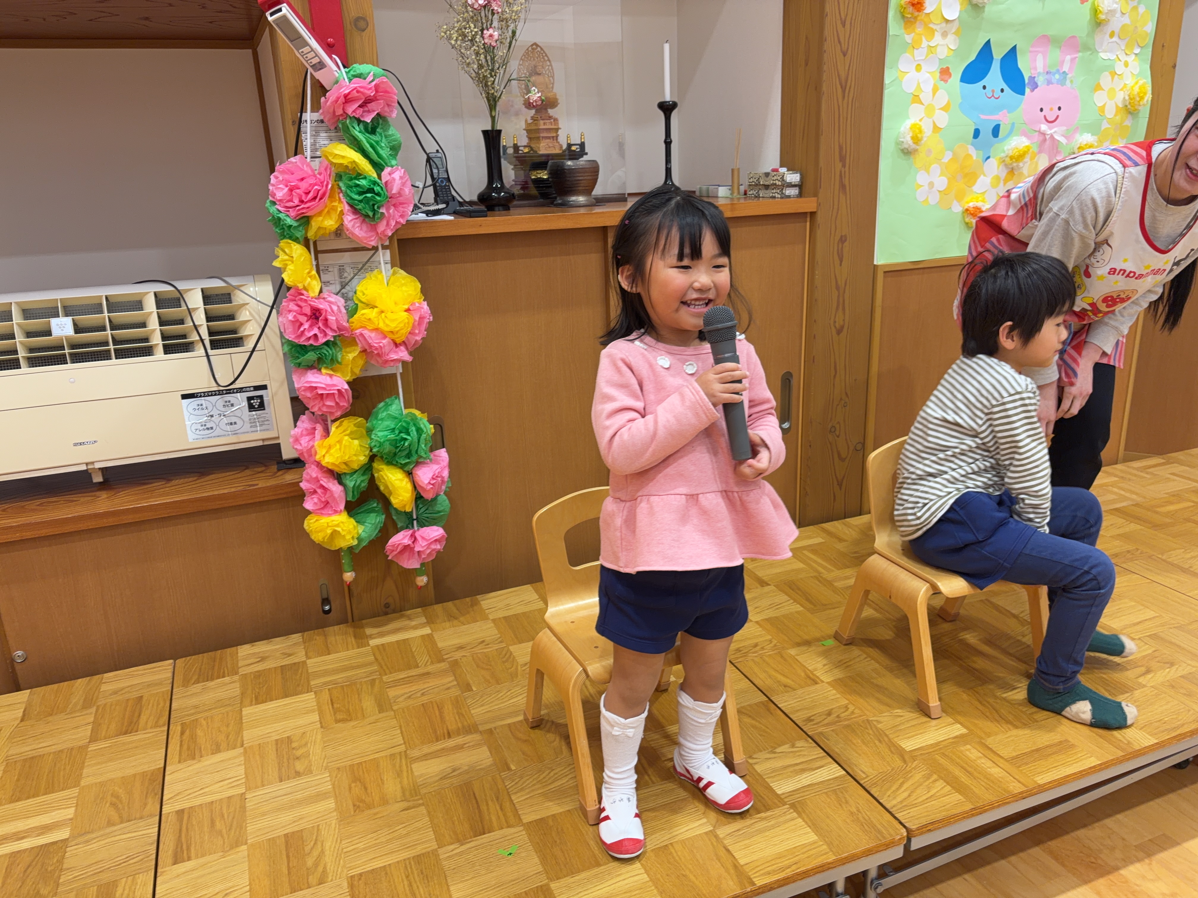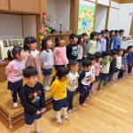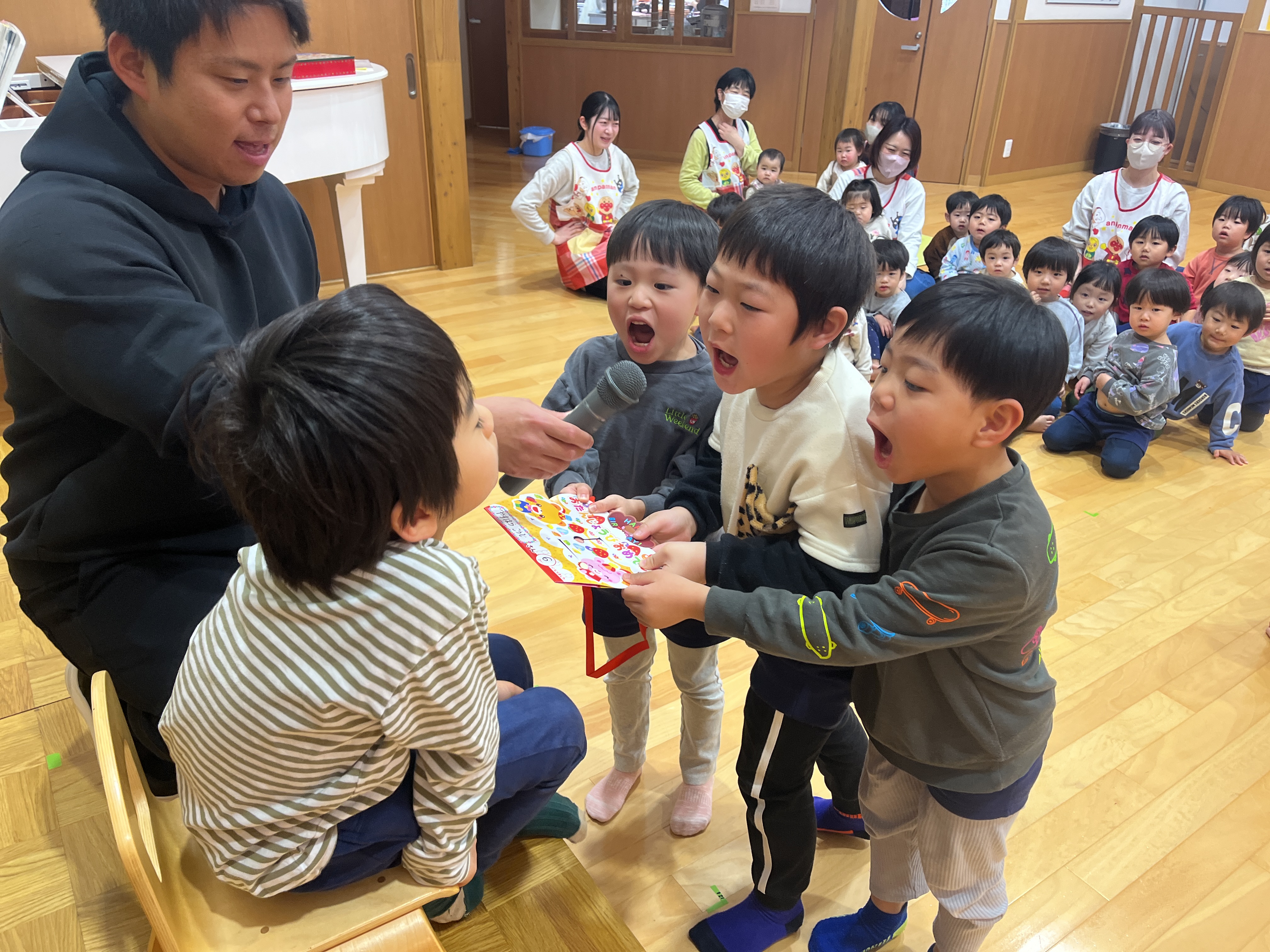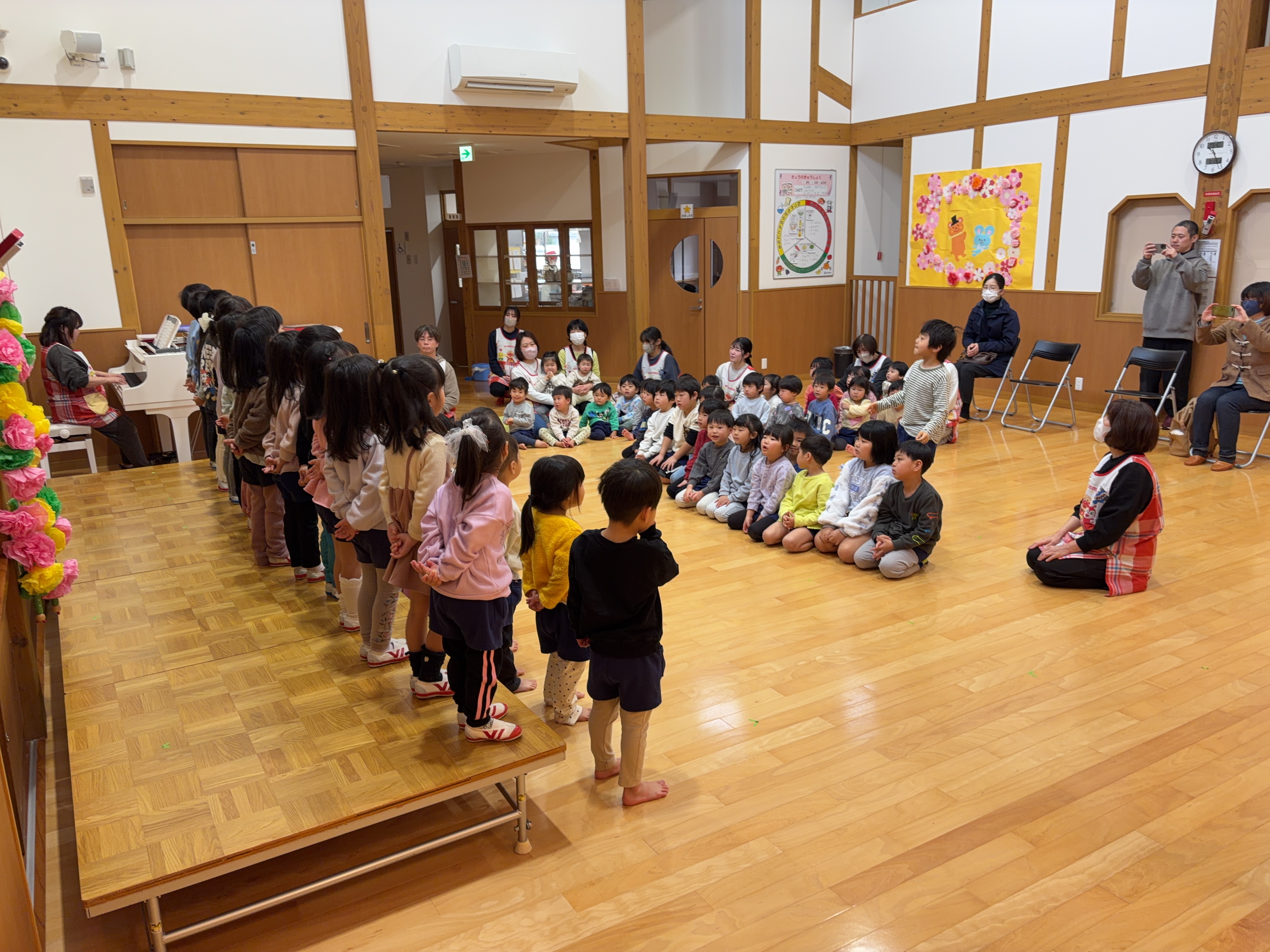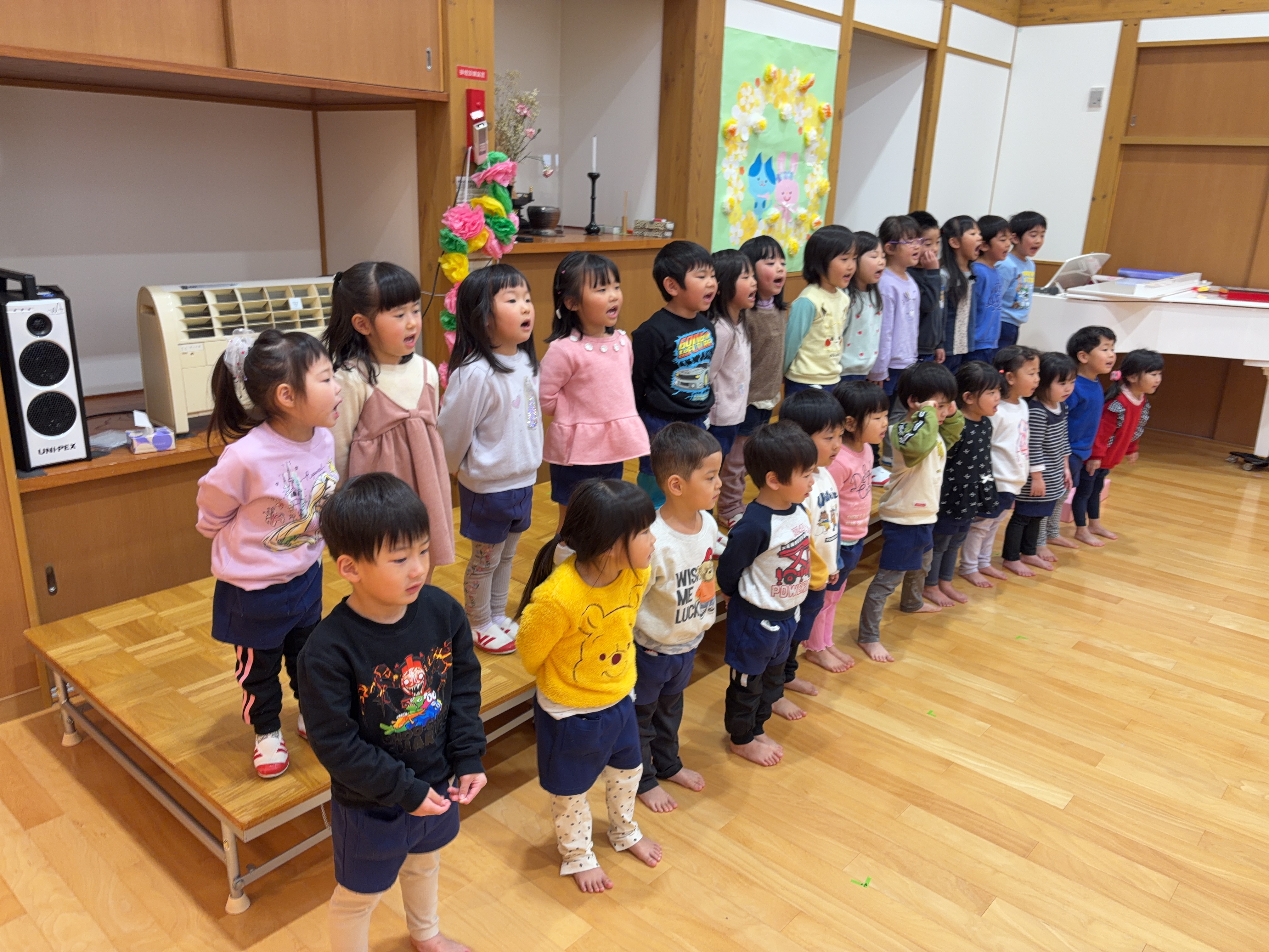 - 引き続きお別れ会を行いました。こあら・ぱんだ組から、大好きなきりん組へ歌のプレゼントをしました。